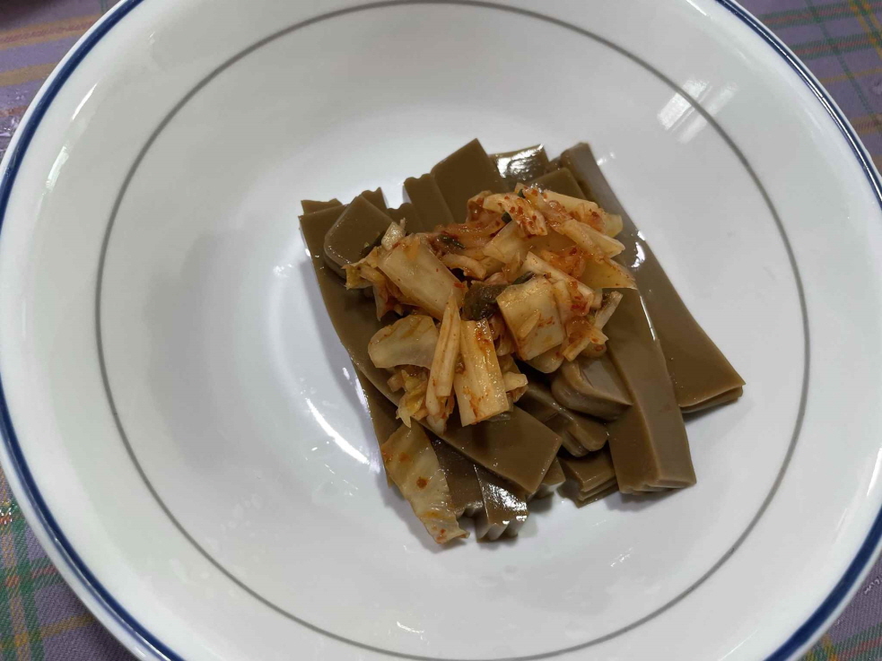 5. 예쁜 그릇에 도토리묵과 김치 오이, 대파를 쌓아 올립니다.