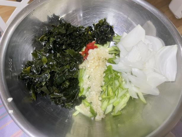 미역 빼고 오이만 넣어도 되지만 미역을 넣으면 더 감칠맛 나고 든든한 것 같아요