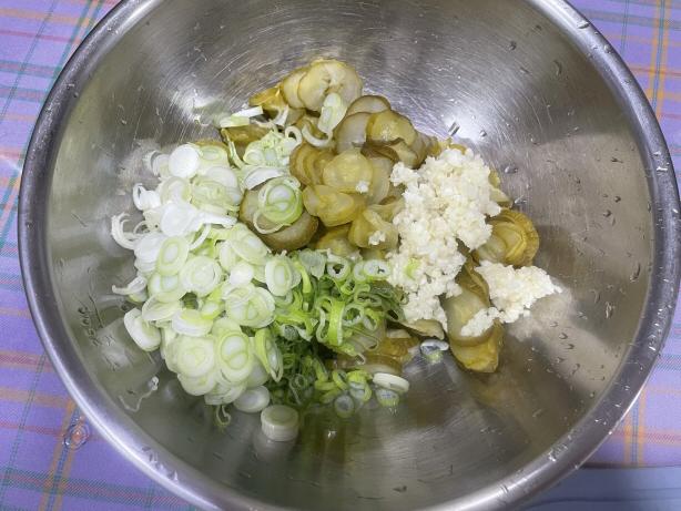 4 꽉 짜서 준비한 오이지에 다진마늘을 넣어줍니다.