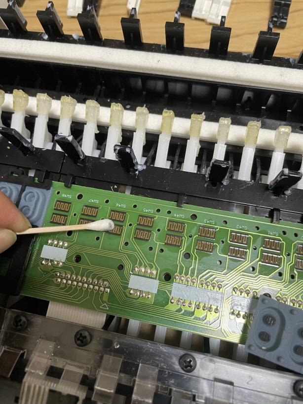 기판의 접점 부위와 고무 스위치도 면봉으로 깨끗이 닦아줍니다.