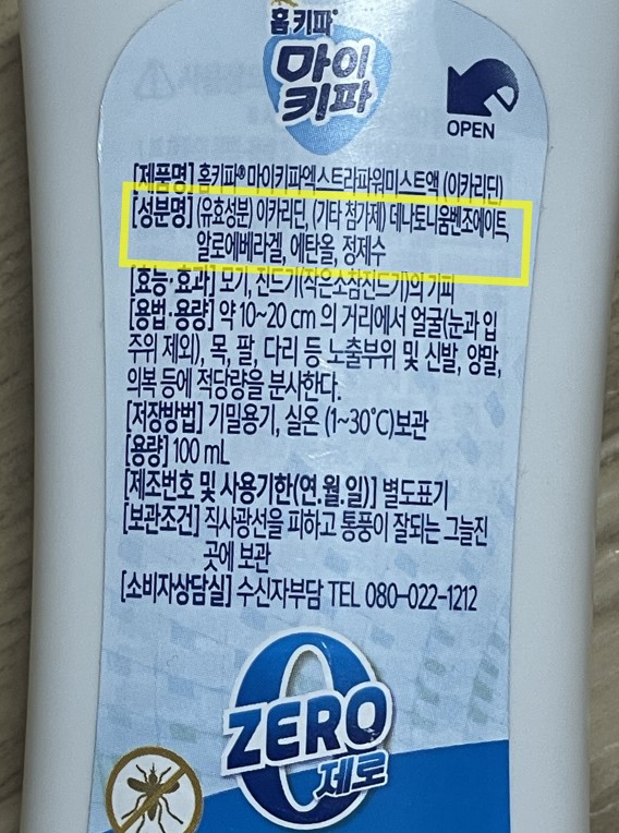피카리딘 (Picaridin): DEET의 대체 성분으로 유럽에서 개발되었습니다. DEET와 유사하거나 더 좋은 효과를 가진다고 알려져 있으며, 피부나 옷에 부작용이 적습니다.