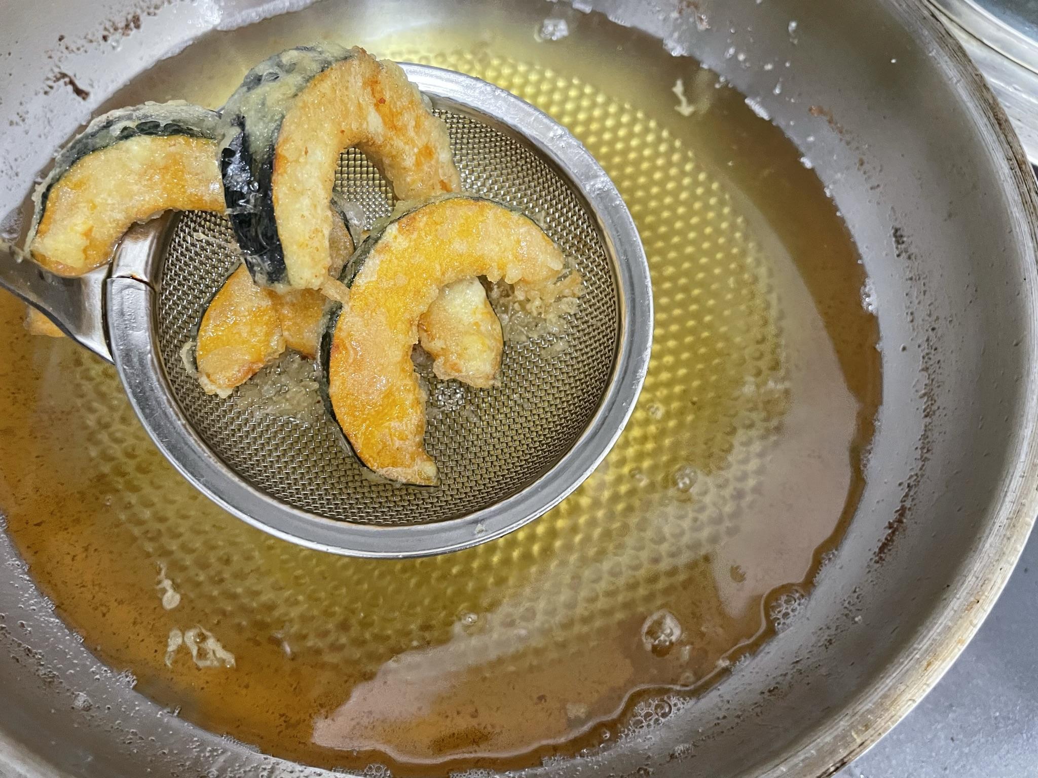 7. 기름온도 170도 정도 되면 단호박을 튀김물에 담근 후 기름에 넣고 튀깁니다.