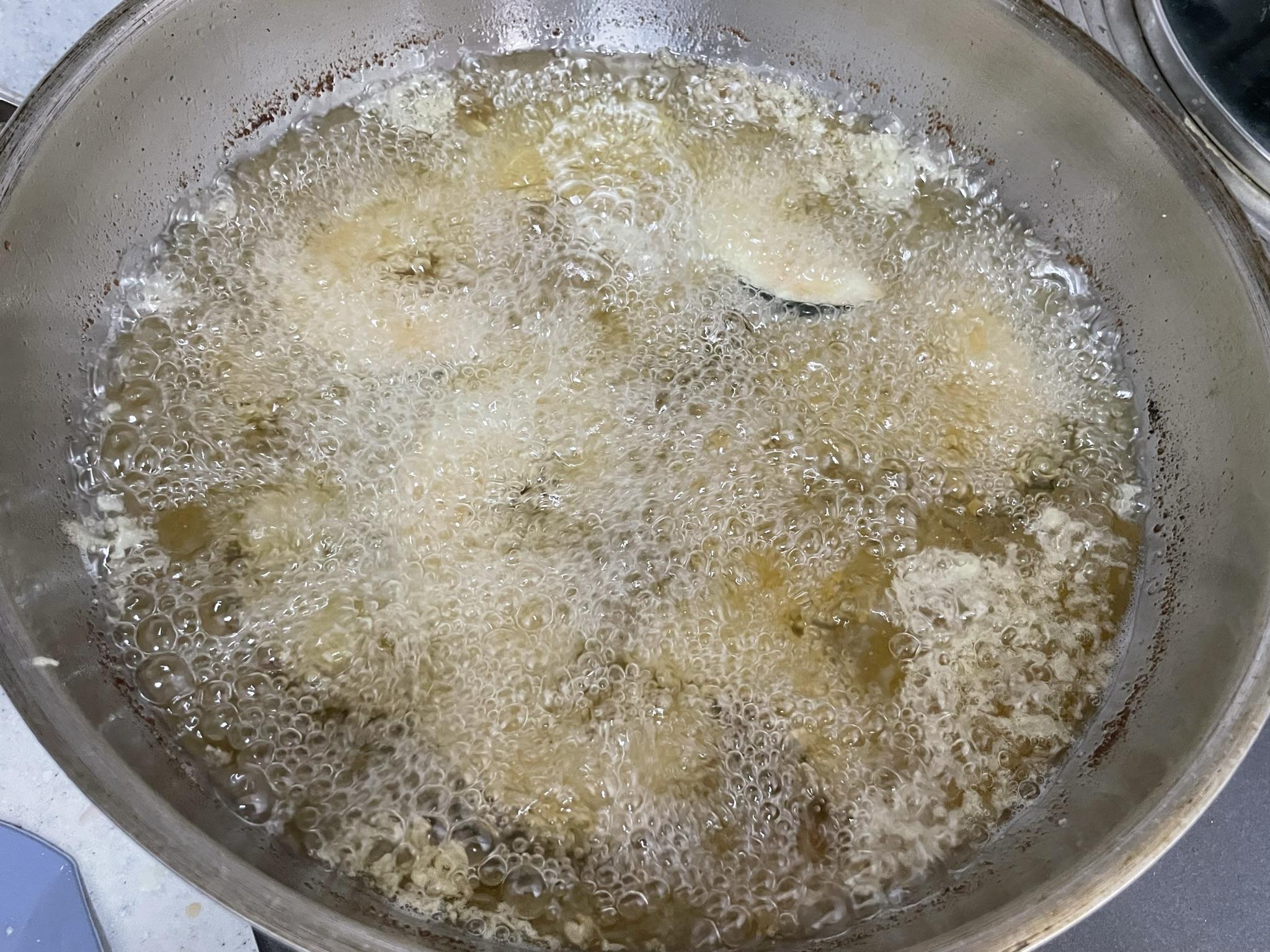 8. 처음에는 많이 부글부글 튀겨지다가 약 2~3분 정도 튀기면 부글부글 하는 정도가 덜해져요. 그럼 다 익은 거예요.