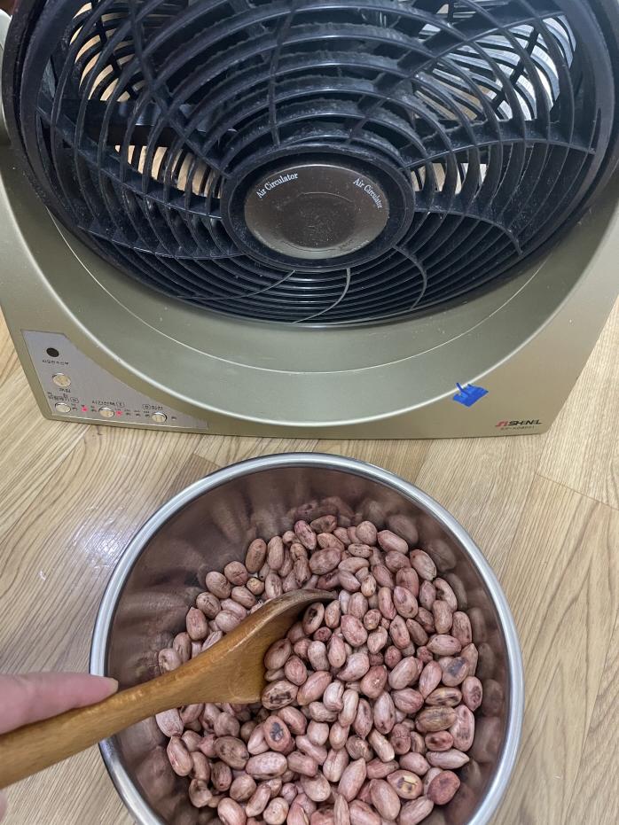 9. 다 볶은 후 식혀 줍니다. 자연 상태 그대로 식혀도 되지만, 저는 선풍기 바람에 식혔습니다. 식히는 중에 껍질 터지는 소리가 납니다.