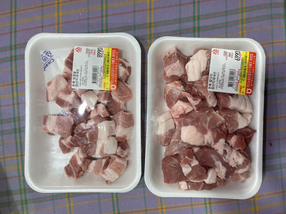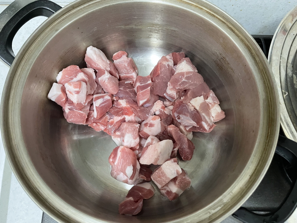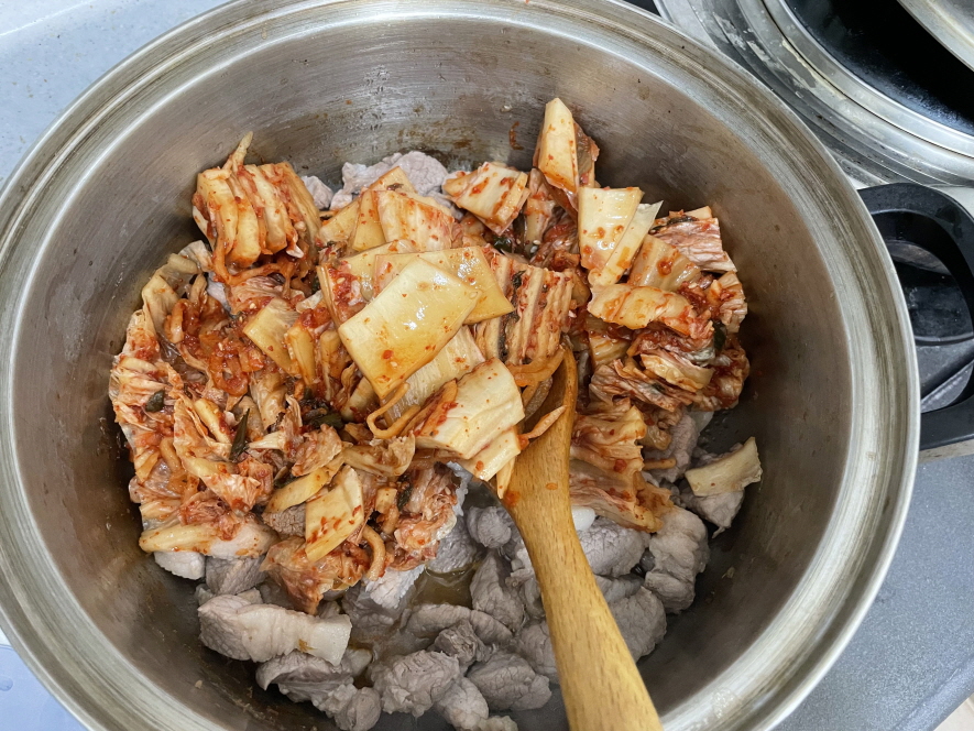 1. 돼지고기 부위는 아무거나 상관없어요. 저희는 삼겹살과 앞다릿살을 섞어서 했어요. 고기양은 취향에 따라 적게 또는 많이 넣어도 돼요. 저희는 700g 넘게 넣었네요. 돼지고기 먼저 냄비에 볶습니다. 스텐 냄비에 볶으면 고기가 붙을 수 있으니 식용유 조금 치고 볶아도 괜찮아요. (돼지고기에서 기름이 나오기 때문에 식용유는 조금만 넣어요)