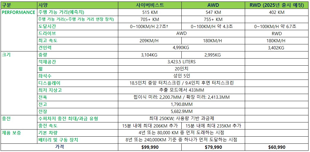 사이버비스트와 AWD모델은 당장 주문이 가능하다고 합니다. RWD모델은 2025년에 출시될 예정이네요. 비싼 거 먼저 팔고 싼 거 팔겠다는 것 같습니다.