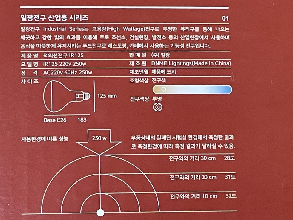 주로 용도는 음식을 따뜻하게 유지시켜주거나 가축, 축사의 보온을 위한 전구입니다.