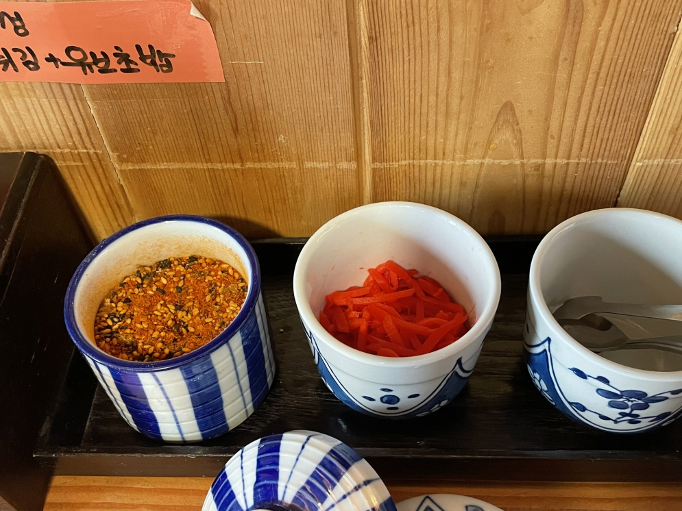 매운맛을 좋아하시는 분은 야갈치우동이 맞을 겁니다. 고명으로 청양고추가 들어가서 국물 맛이 좀 매워요. 건더기로 순살 치킨이 들었어요.