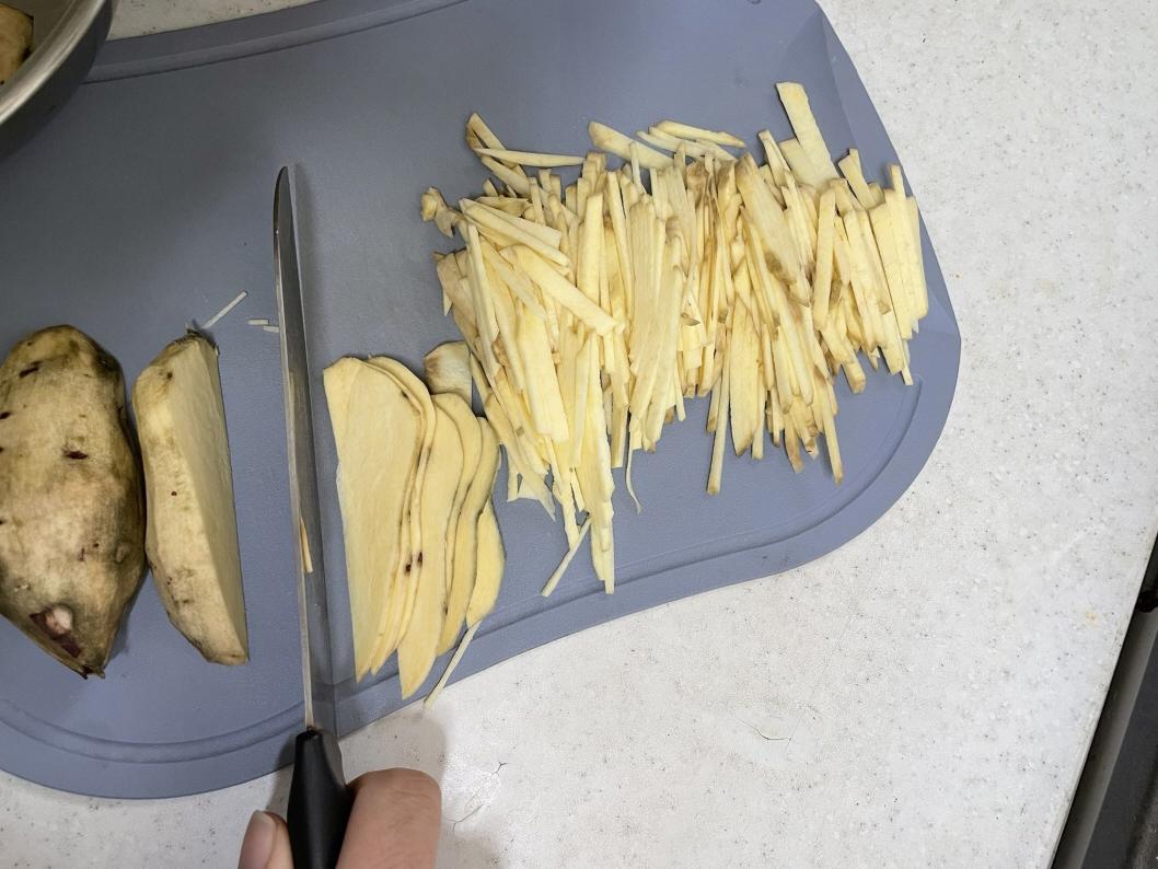 깨끗이 씻은 고구마의 껍질을 제거하여 준비합니다.
