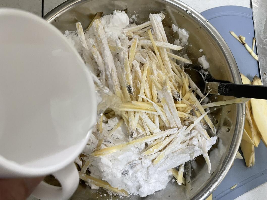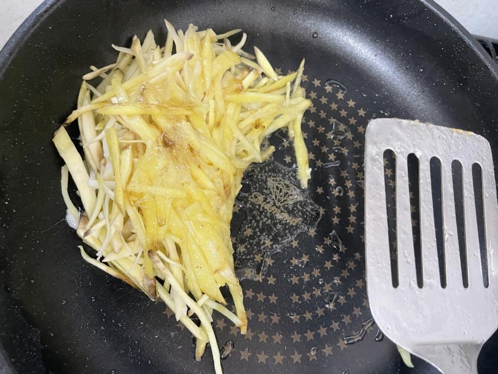프라이팬에 식용유를 넉넉히 두르고 전분물이 굳었으면 손으로 풀어주면서 전분물 묻은 고구마채를 프라이팬에 한 움큼 펴서 올려놓습니다. 옆으로 빠져나온 고구마채를 정리하여 동그란 전 모양으로 만듭니다.