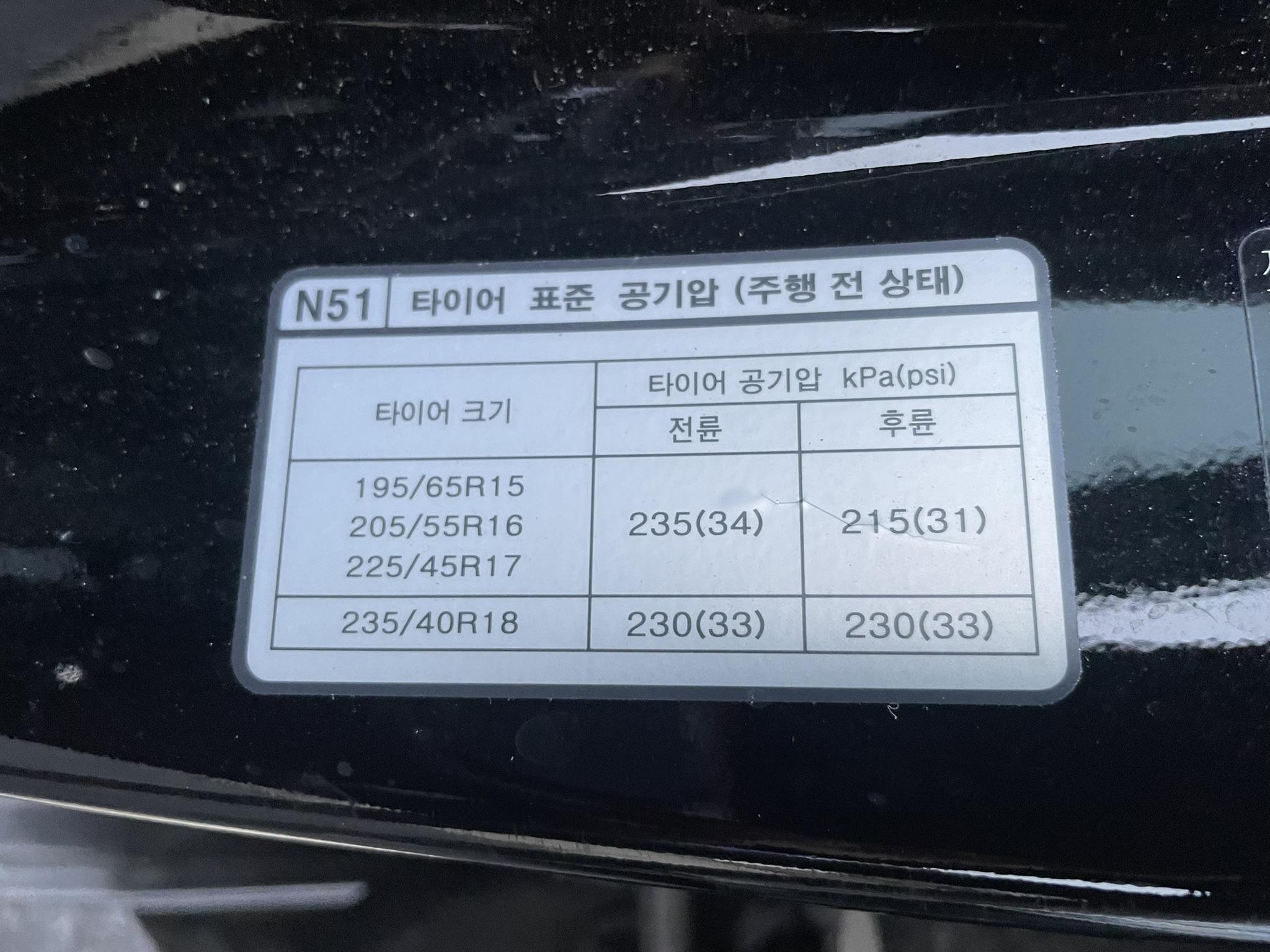 자동차 타이어마다 적정 공기압을 넣어야 하는데요. 타이어의 공기압을 얼마나 채워야 하는지 모를 때에는 운전석 문짝을 열고 시트 옆부분을 보면 차량에 맞는 타이어별 표준 공기압이 표기되어 있습니다. 거기에 나와 있는 수치를 참고하면 되고요. 승용차의 경우 일반적으로 35PSI입니다.