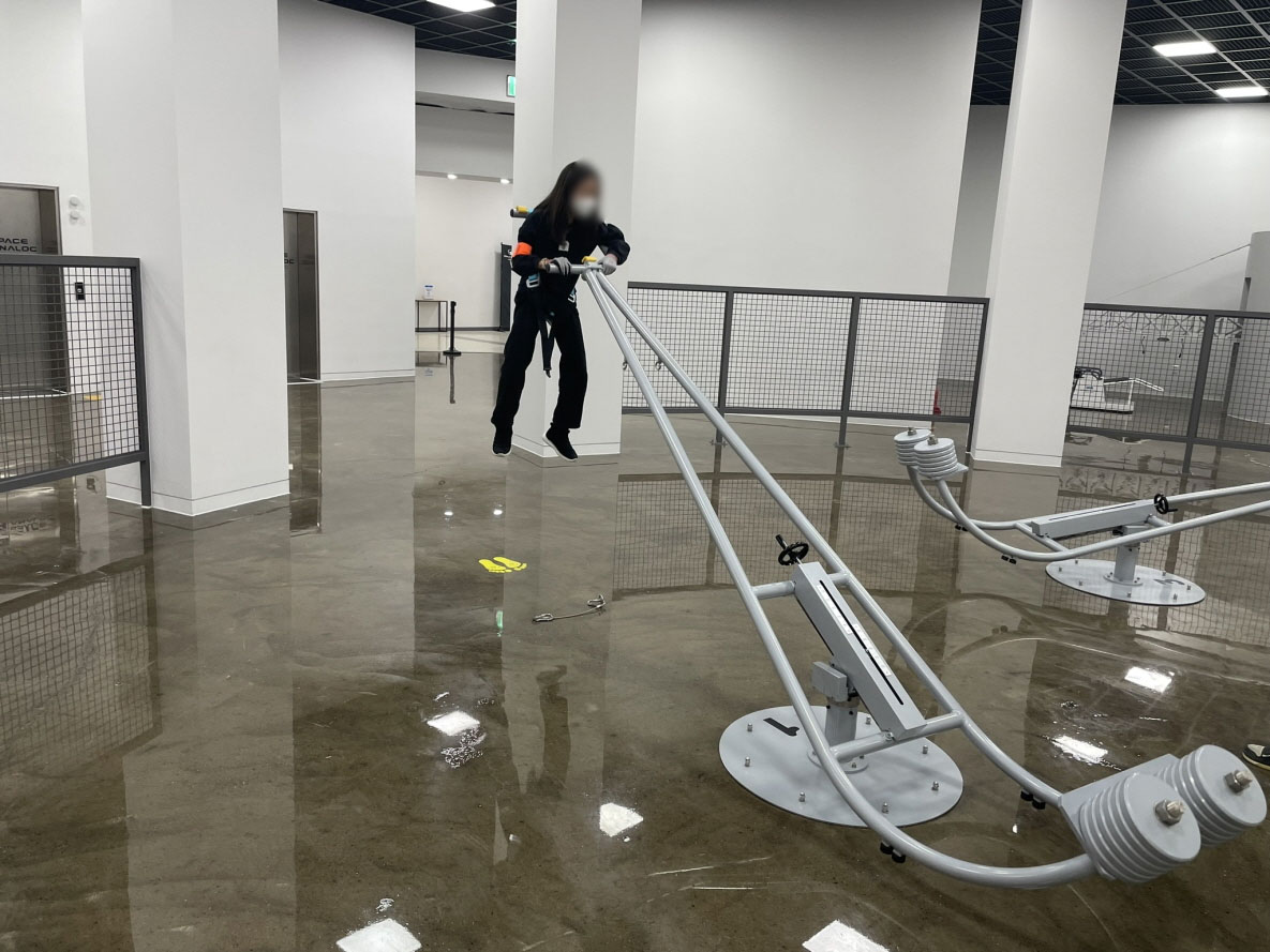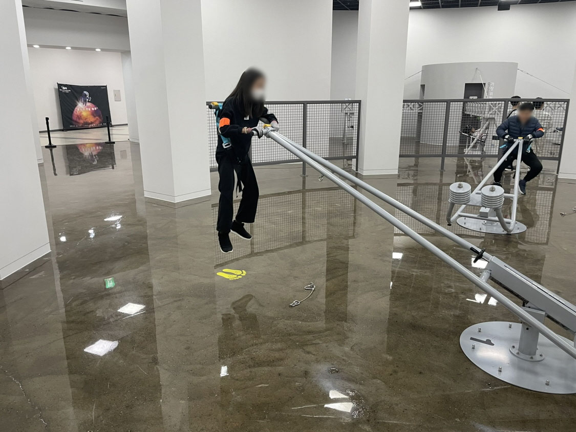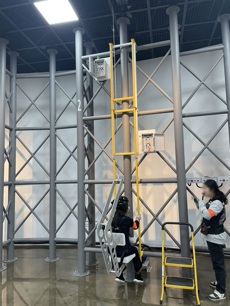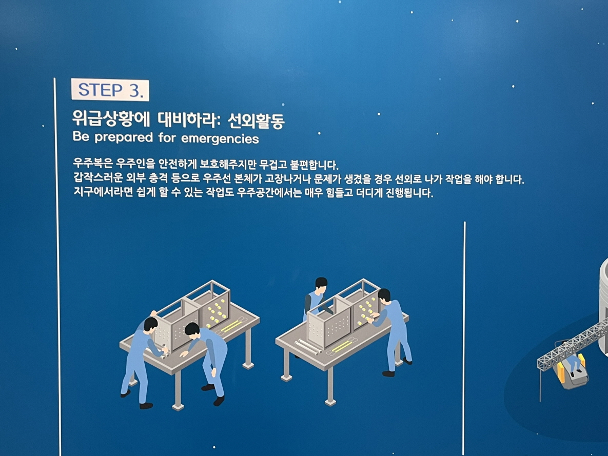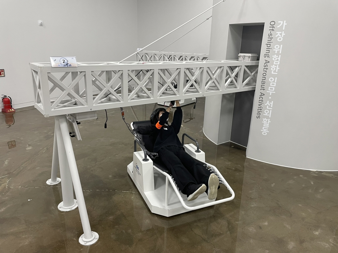 우주선 밖에서 우주유영을 가정하여 안전고리를 걸어 몸을 고정하고 우주선 구조물을 잡으며 선외 수리를 하는 체험입니다.