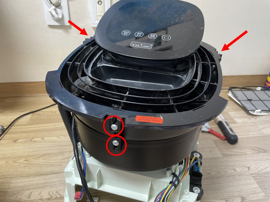 이건 굳이 안 해도 되는데 모터 덮개를 빼내면 좀 더 깨끗이 닦을 수 있어요.