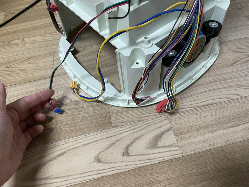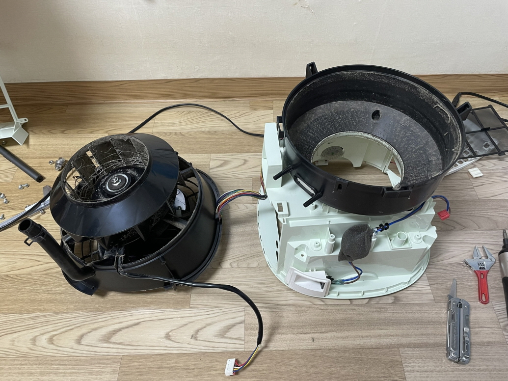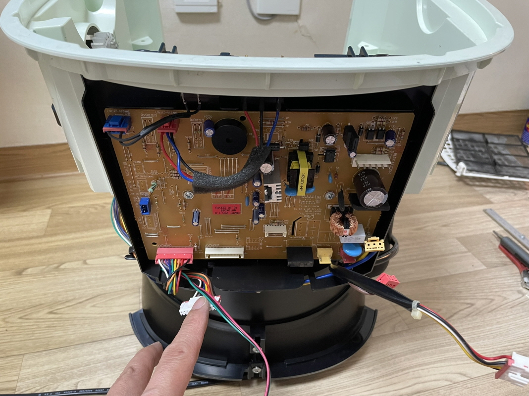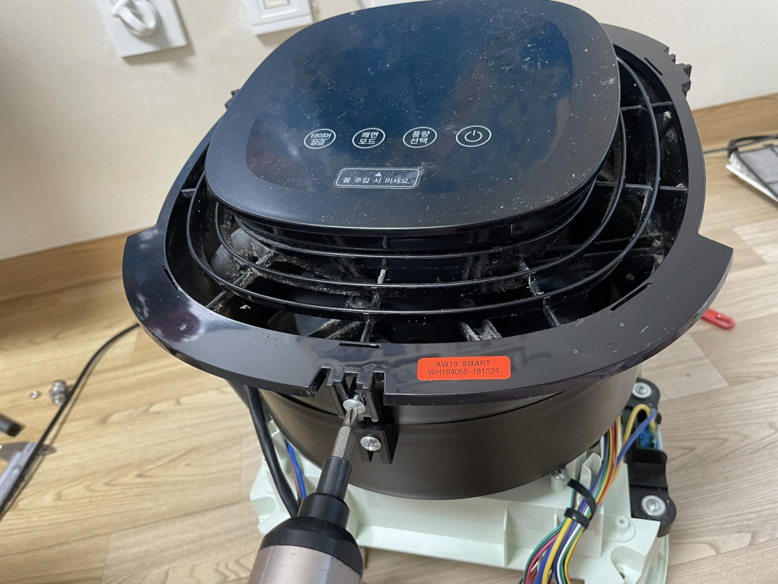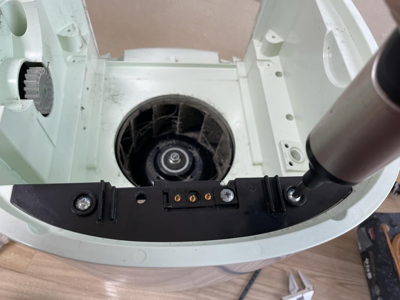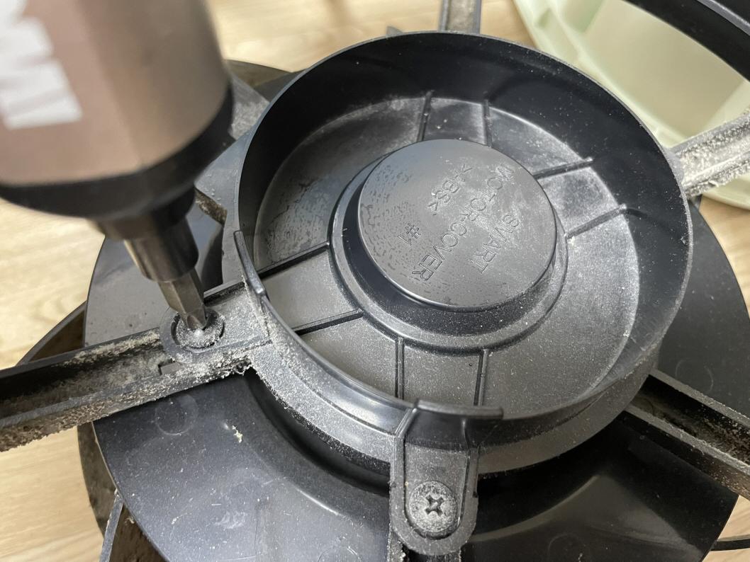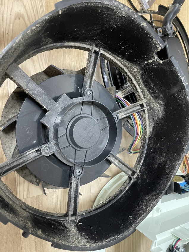 그 아래 팬에 머리카락과 먼지가 많이 껴 있어요. 모든 피스 볼트를 제거하였으면 덮개와 분리됩니다.