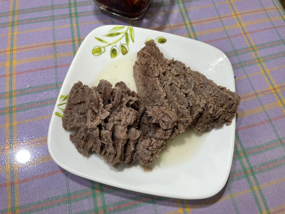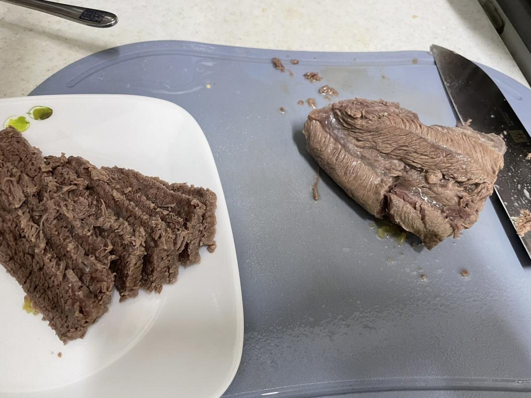 4. 고기를 건져내어 고기결의 반대 방향으로 얇게 썰어 접시에 담습니다. 그래야 고기가 부드럽고 맛있어요. 육수를 약간 고기 위에 뿌려서 고기를 먹는 동안 촉촉한 상태로 유지합니다.