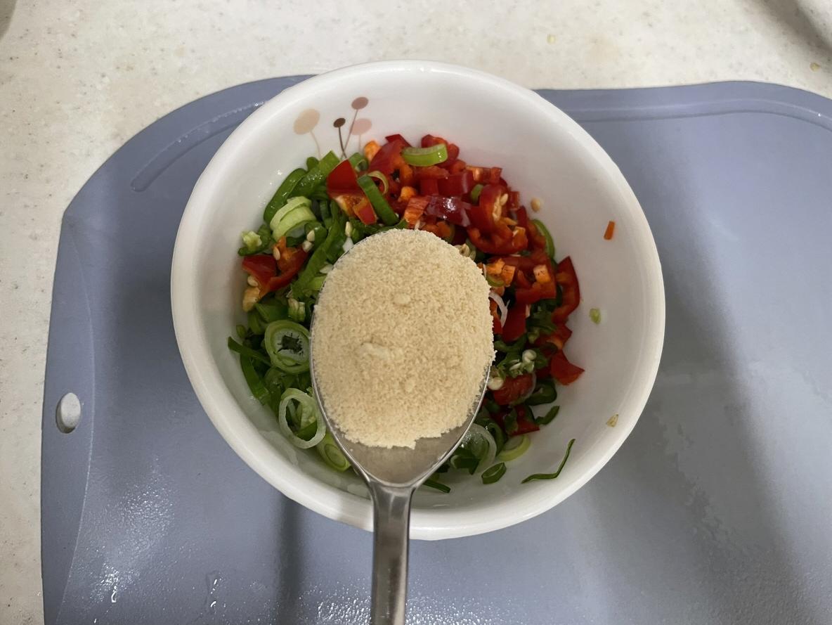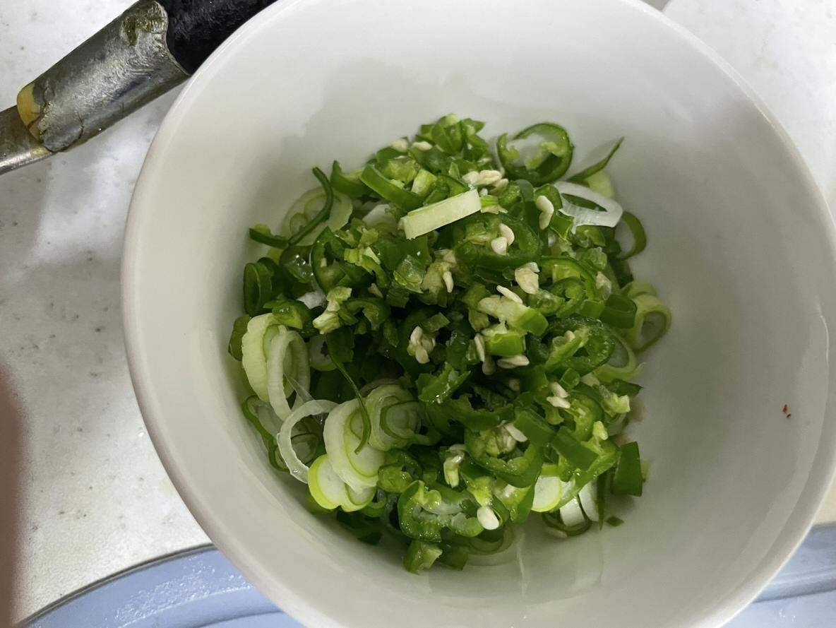 1. 송송 썰은 대파와 홍고추, 청양고추를 작게 썰어서 그릇에 담아요.