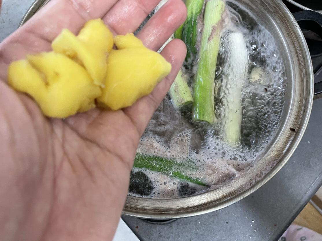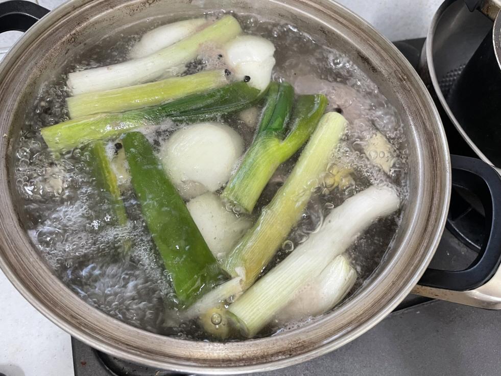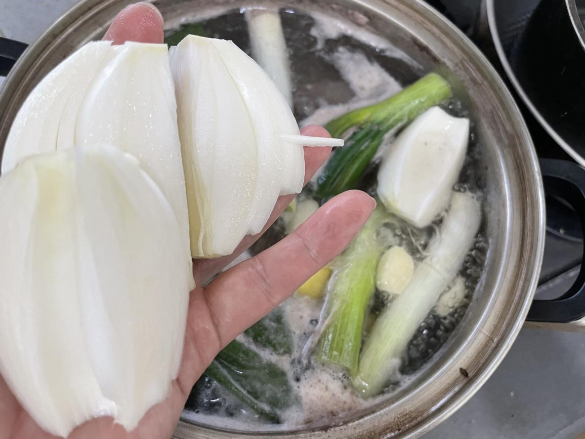 3. 대파를 크게 썰어 넣고 통마늘, 생강, 통후추, 양파를 넣어 1시간 30분 정도 끓입니다. 거품이 생기면 거품만 걷어냅니다.