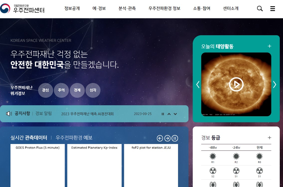 1 태양활동 지수 확인 – 일기예보처럼 메일 태양활동 정보를 확인합니다. 확인기관은 국립전파연구원 우주전파센터(https://spaceweather.rra.go.kr/main.do)에서 확인 가능 합니다.