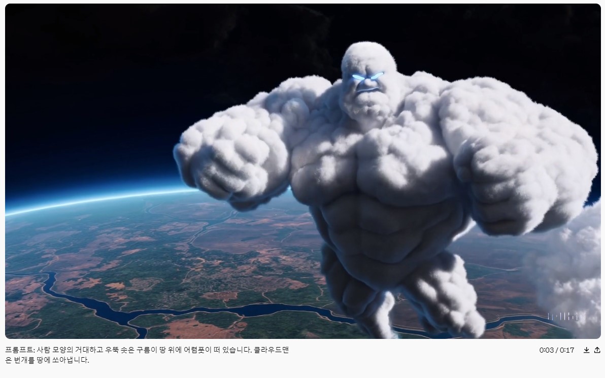 텍스트 문장 몇 개만 입력하면 그 문장대로 동영상을 만들어 줍니다. 사람이 카메라로 찍은 영상이 아닌 인공지능이 창조해 낸 영상인 것이죠.