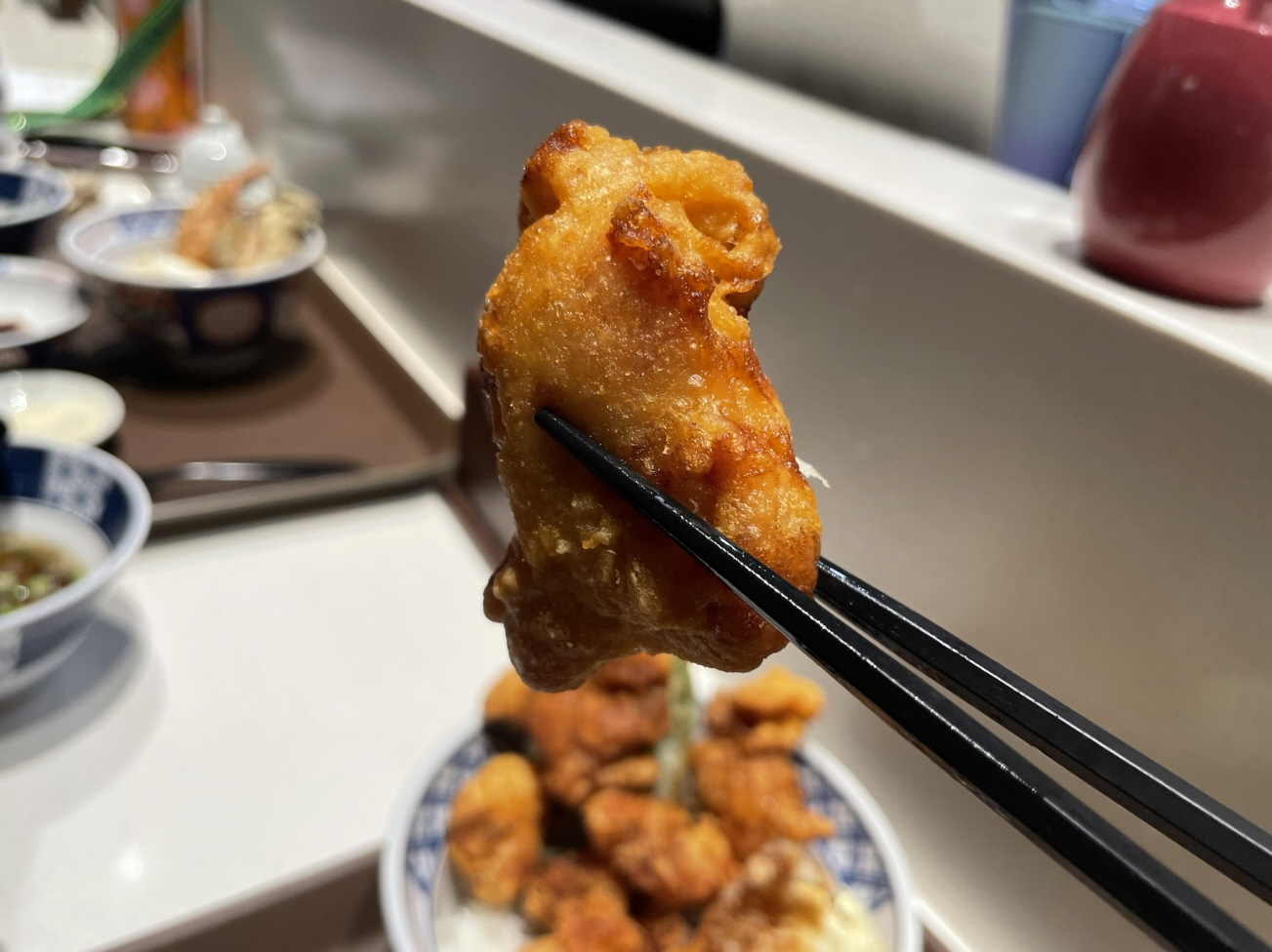 가라아게텐동은 닭튀김, 타마고, 꽈리고추로 구성되어 있습니다.