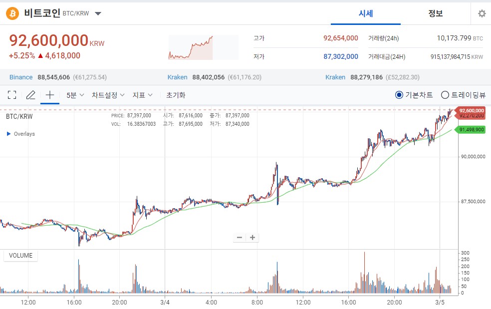 오늘도 비트코인이 큰 폭으로 상승하는 모습을 볼 수 있는데요. 사상 최고가인 9,200만원을 넘기는 모습이네요. 정말 몇일안에 전문가의 예상대로 1억을 찍는 모습도 볼 수 있을 것 같습니다.