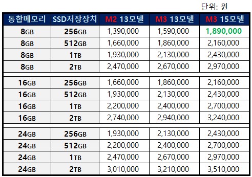 아래 표에 M2 13형 모델과 M3 13형, 15형 모델을 메모리, SSD 용량별 가격을 비교했어요.