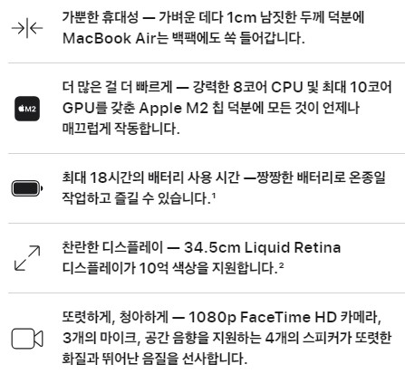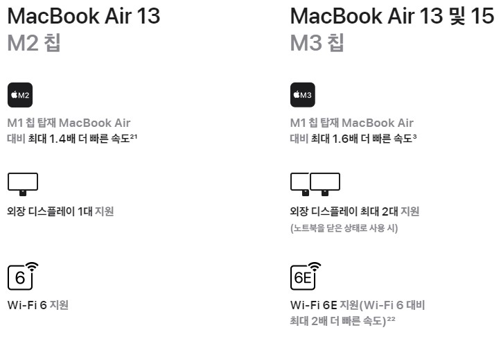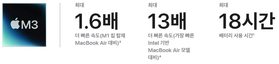 하지만 이번에 공개된 사양을 볼 때 이 전 모델과 비교해 보면 그렇게 크게 사양이 개선된 것 같지 않아요. 이전 모델인 M2 칩과 M1칩 맥북 에어를 사용 중이라면 중복투자 하기보다는 내년까지 기다렸다가 새로운 모델을 구입해도 괜찮을 것 같아요.