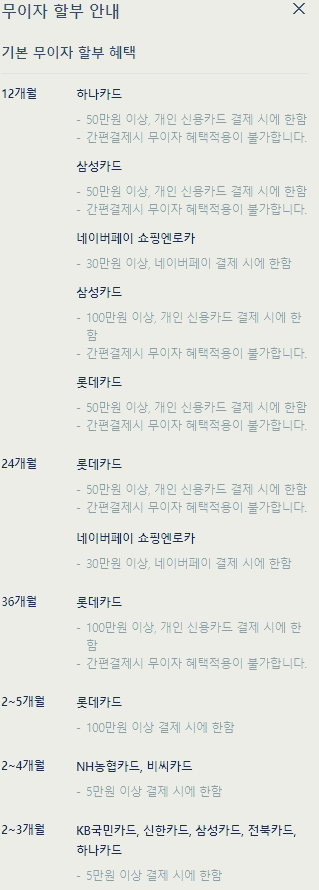 무이자 할부는 하이마트보다 짧은 최대 22개월(국민카드)까지만 가능해요.