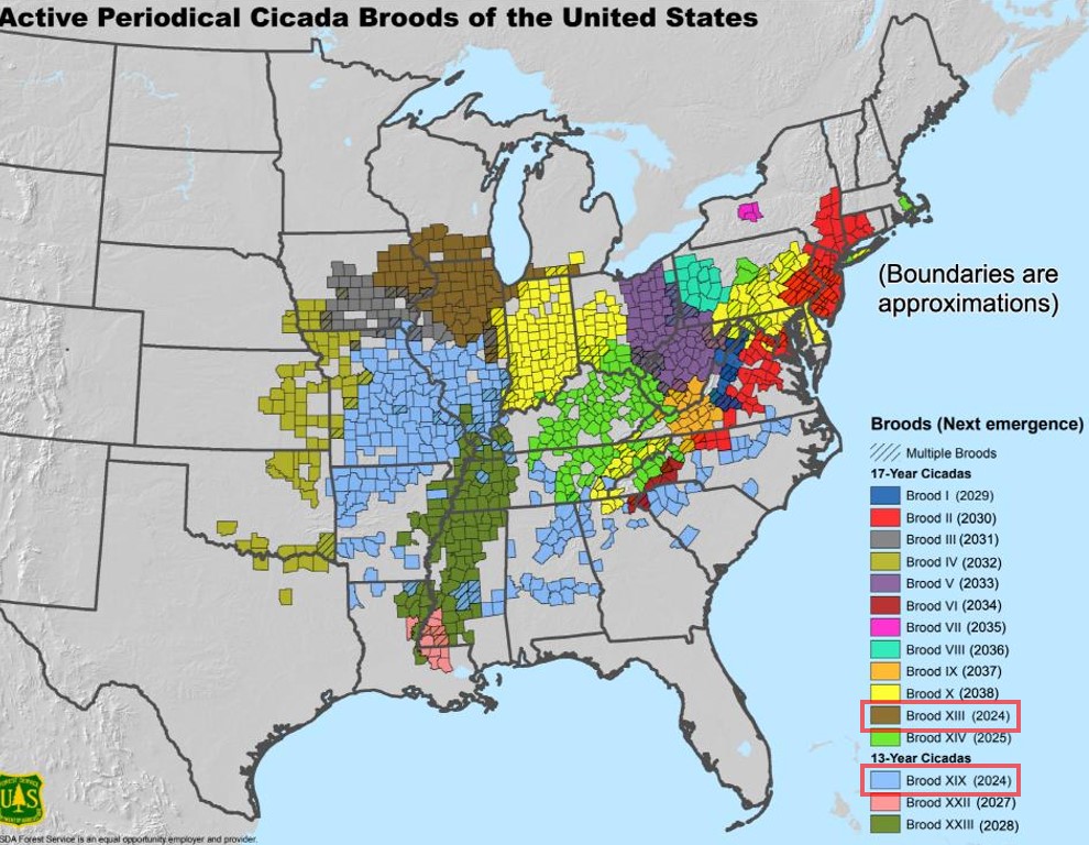 곤충학자들은 4월 말(2024년) 부터 올여름 말까지 Periodical Cicada(주기성 매미) 2개 종이 같이 땅 위로 올라와서 활동할 것으로 예상하고 있습니다.
