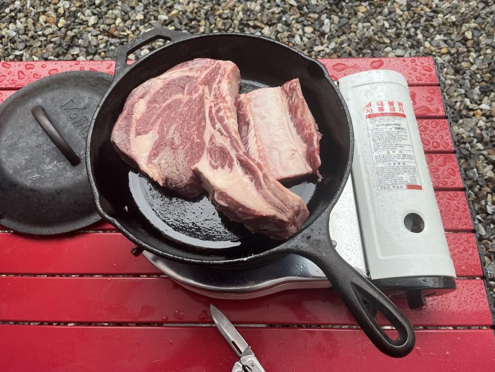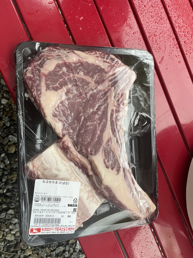 저녁으로는 호주산 토마호크 스테이크입니다. 토마호크 스테이크는 인터넷으로 구매했는데 프라이팬에 구울 거니까 뼈 부분은 잘라달라고 코멘트 남겼는데 딱 맞는 크기로 잘라 주셨네요. 토마호크도 요즘은 미국산이 많고 호주산은 많이 안 팔더라고요.