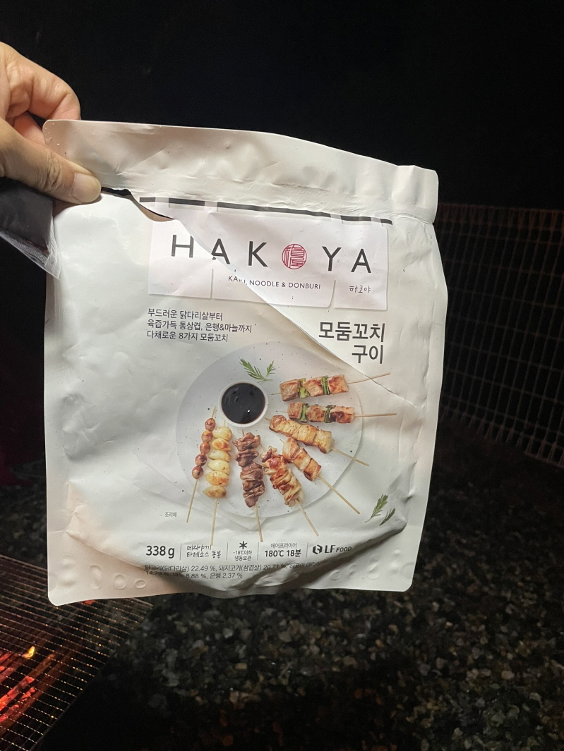그 다음으로는 이마트에서 산 하코야 모듬꼬치구이화로에 구워 먹기 좋은 간편식입니다. 사진에 나와 있는 모양과 수량대로 들어있어요. 좀 모자란 것 같아서 추가로 구매한 돼지등갈비 구이도 해먹었어요. 소스는 스테이크소스와 케첩을 섞어서 발라주었습니다.