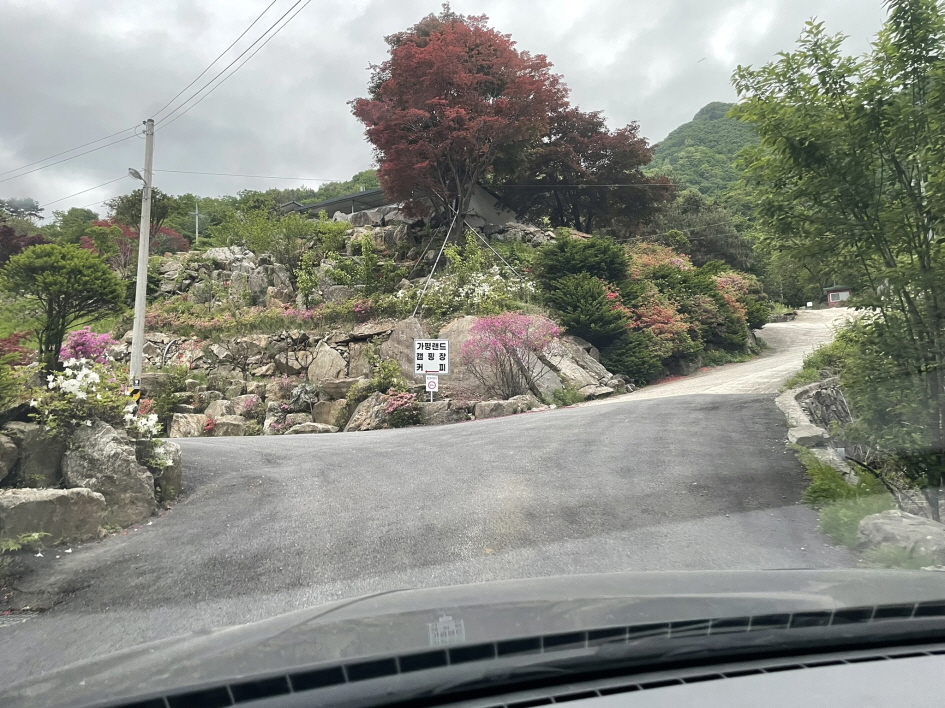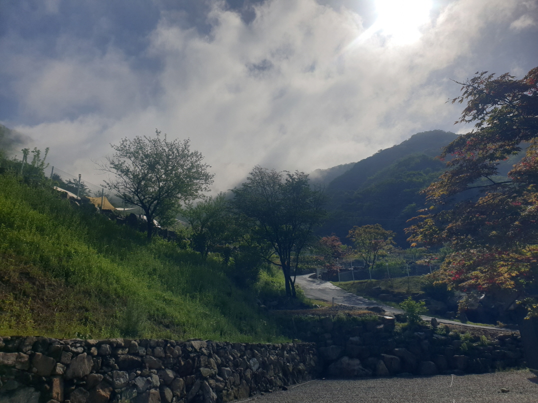 캠핑장 진입로가 산길입니다. 골목입구부터 약 4km 정도를 산길로 올라와야 해요. 운전이 어렵지는 않아요.