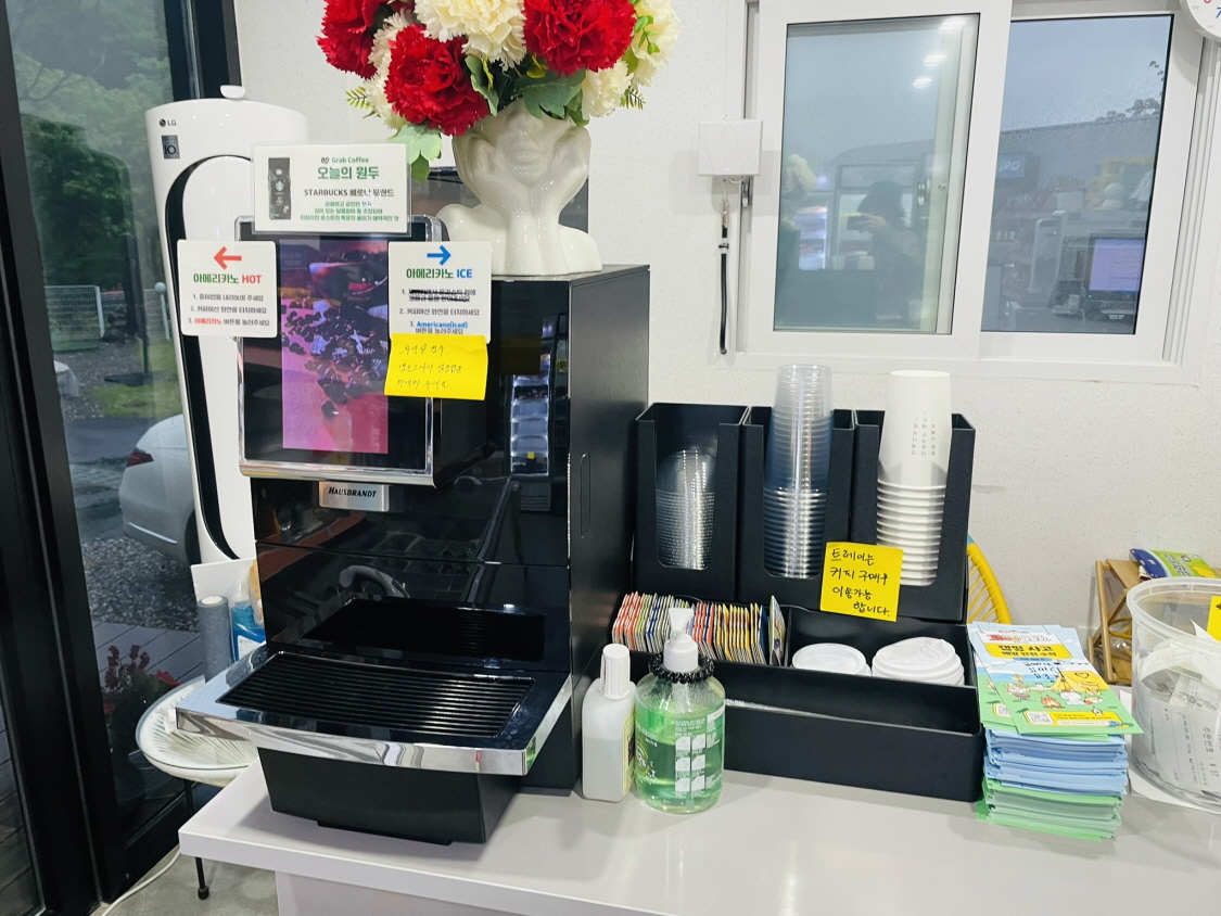 매점은 무인으로 운영되는 키오스크입니다. 밤늦게까지 물품을 구매할 수 있어요. 한 가지 아쉬운 건 키오스크 항목에 사진등록이 많이 안 되어 있어서 구매 물건 찾기가 어려웠어요.