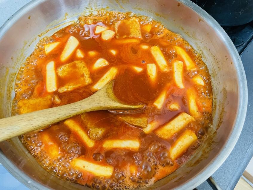 조리 방법은 간단해요. 냉동식품이니까 얼어 있는 쫀득통통 밀떡, 매콤달콤 고구마소스, 감칠맛 떡볶이 육수, 부산한입 어묵을 모두 프라이팬에 넣고 4분 정도 끓이면 끝이에요.