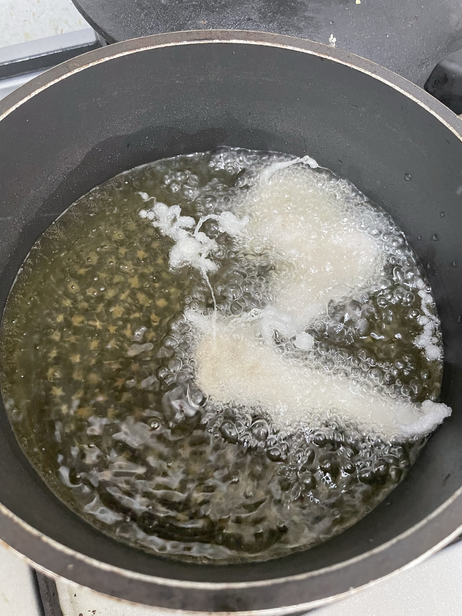 7. 고기를 물전분에 넣어 충분히 적신후 뜨거운 기름에 넣어 튀깁니다.