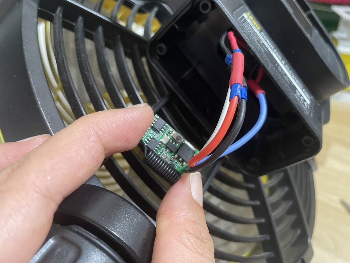하이코 선풍기의 뒤쪽측면에 있는 제어박스를 열고요. 기존 모듈을 제거합니다.