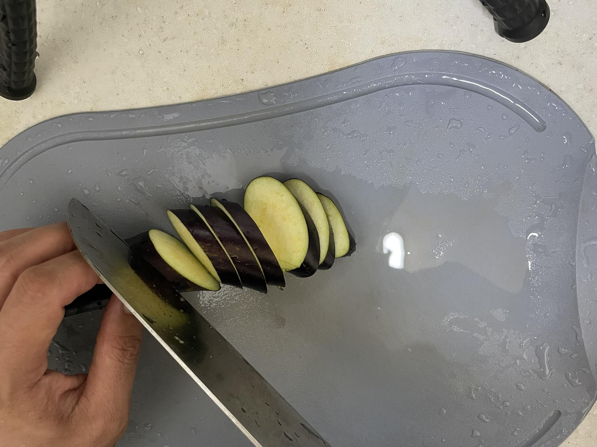 가지는 두껍고 길게 어슷 썰어 준비합니다. 가지가 익으면 두께가 얇아집니다. 조금 두껍게 썰어야 밥하고 먹을 때 맛있어요.