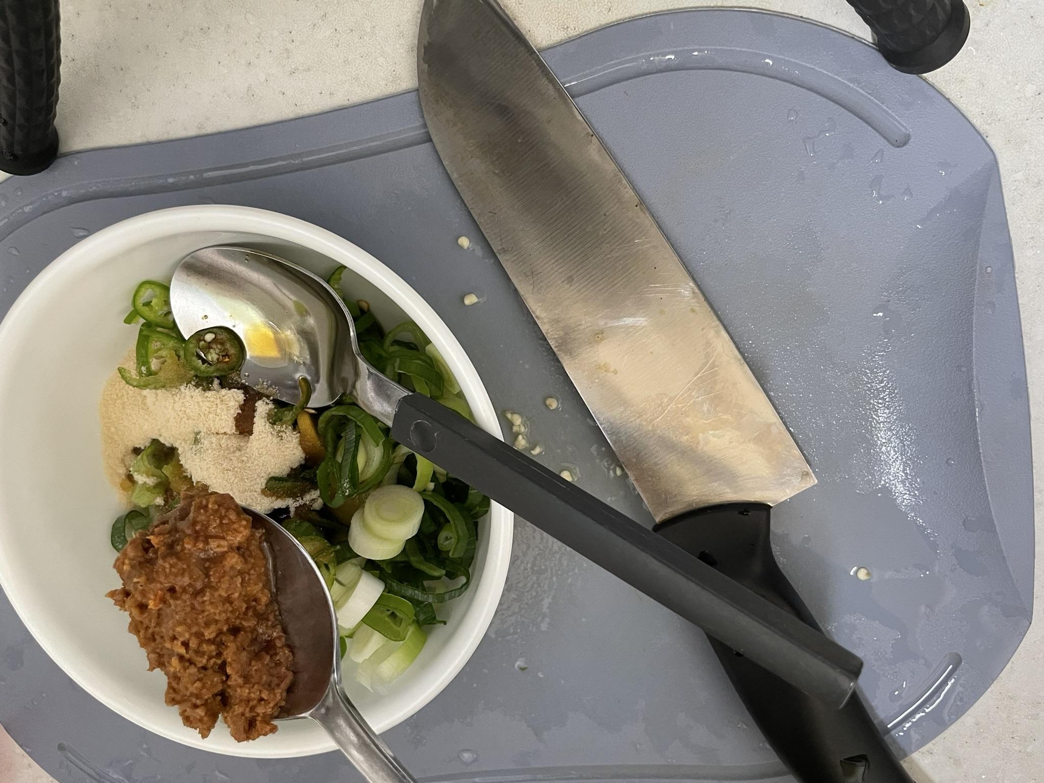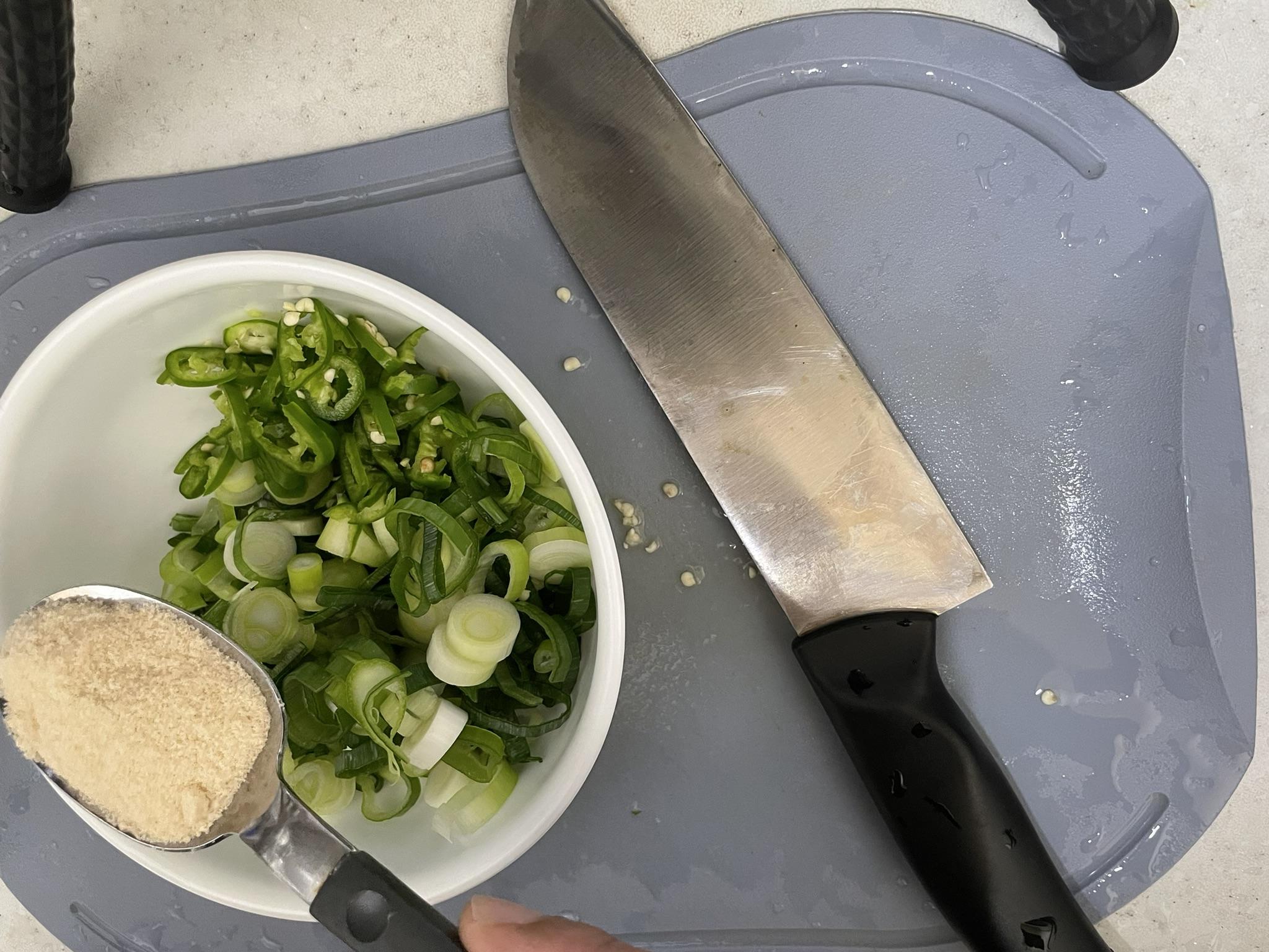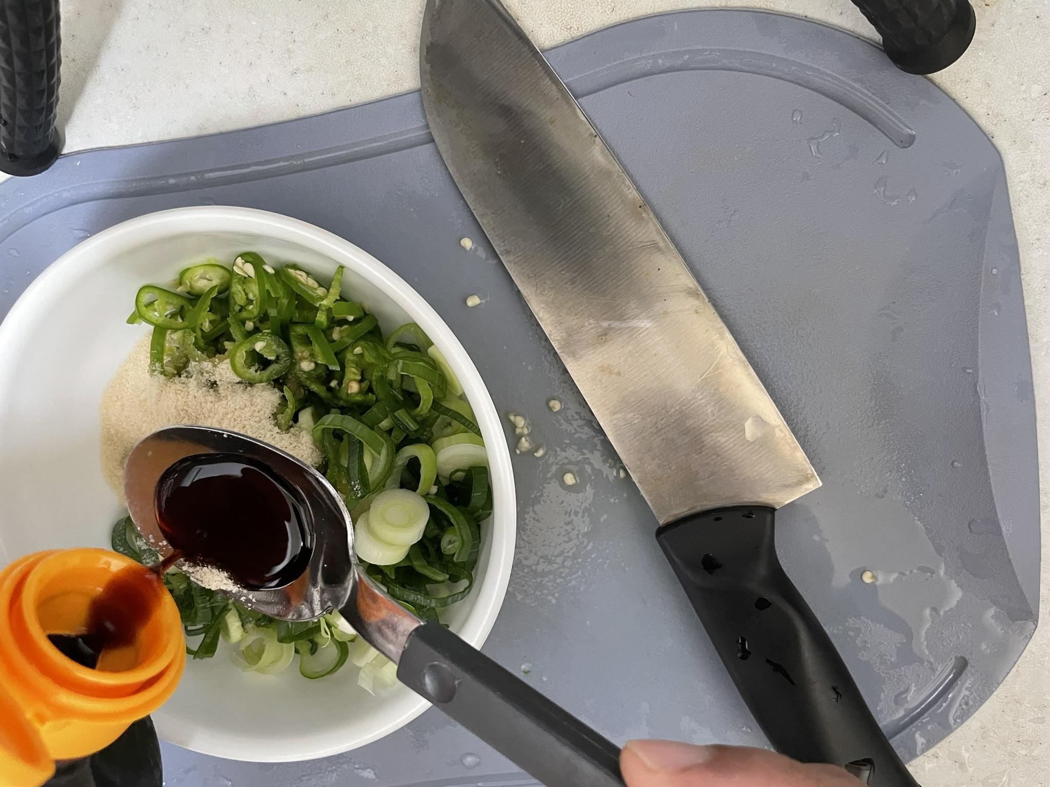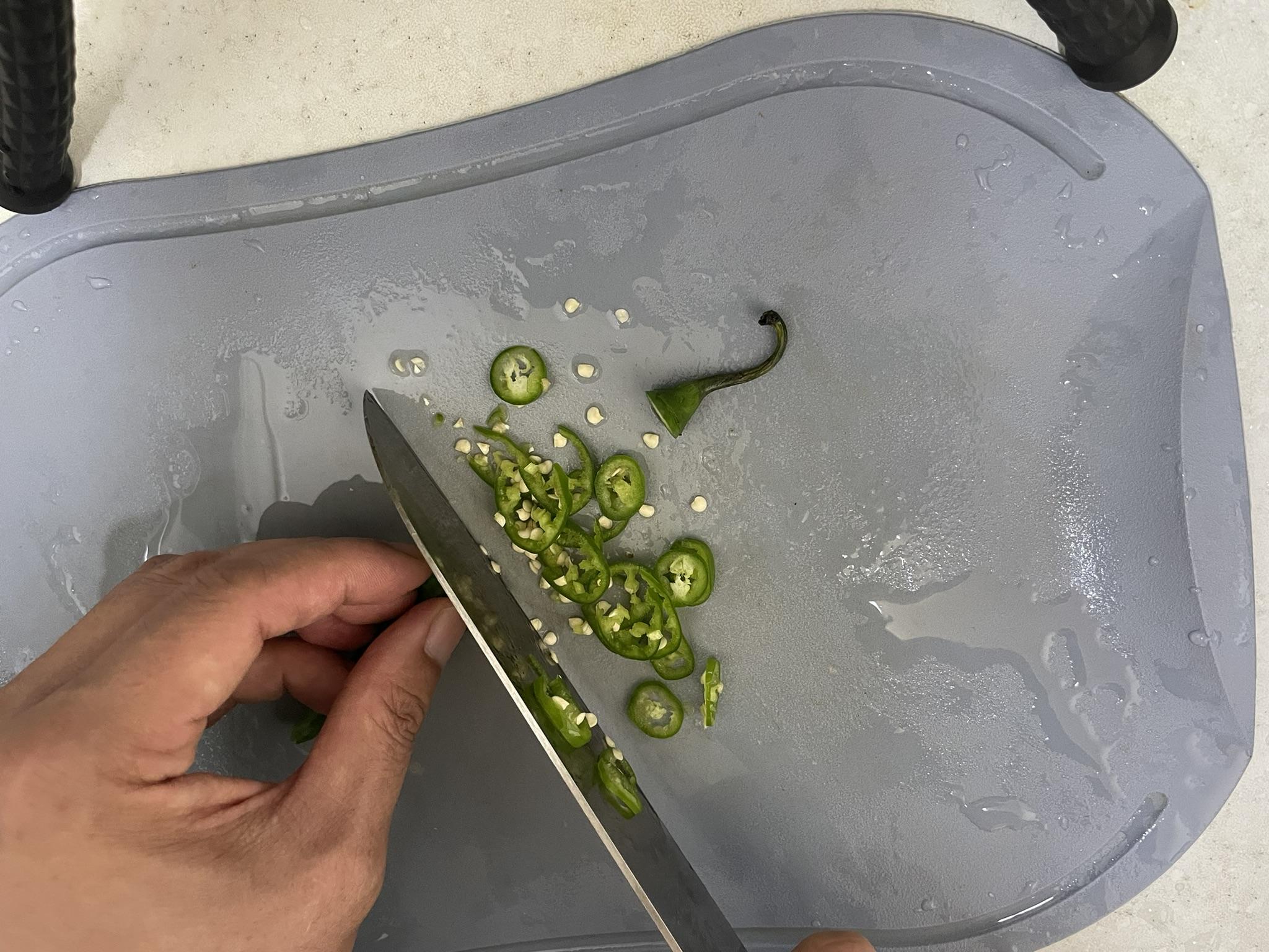 청양고추를 얇게 썰어서 대파와 섞어요.