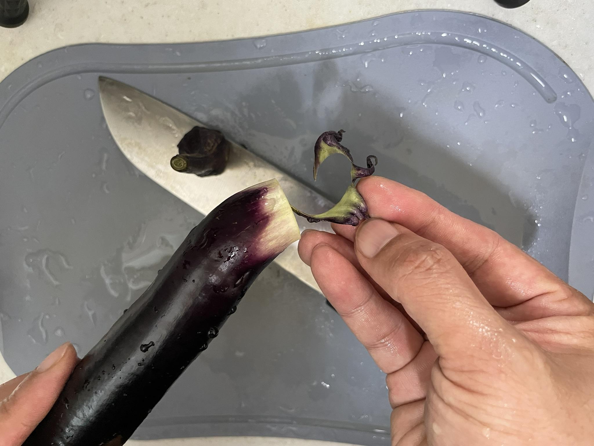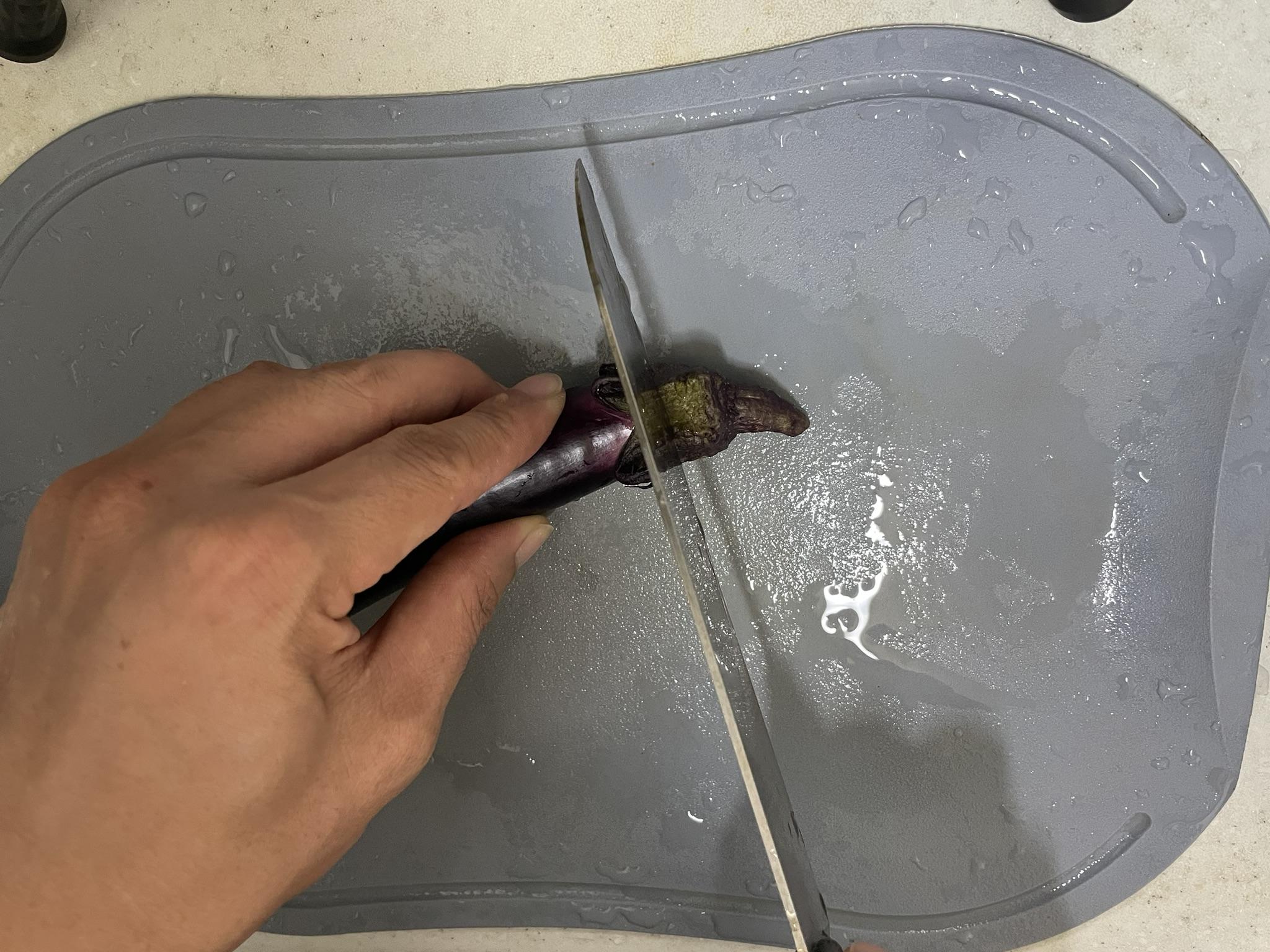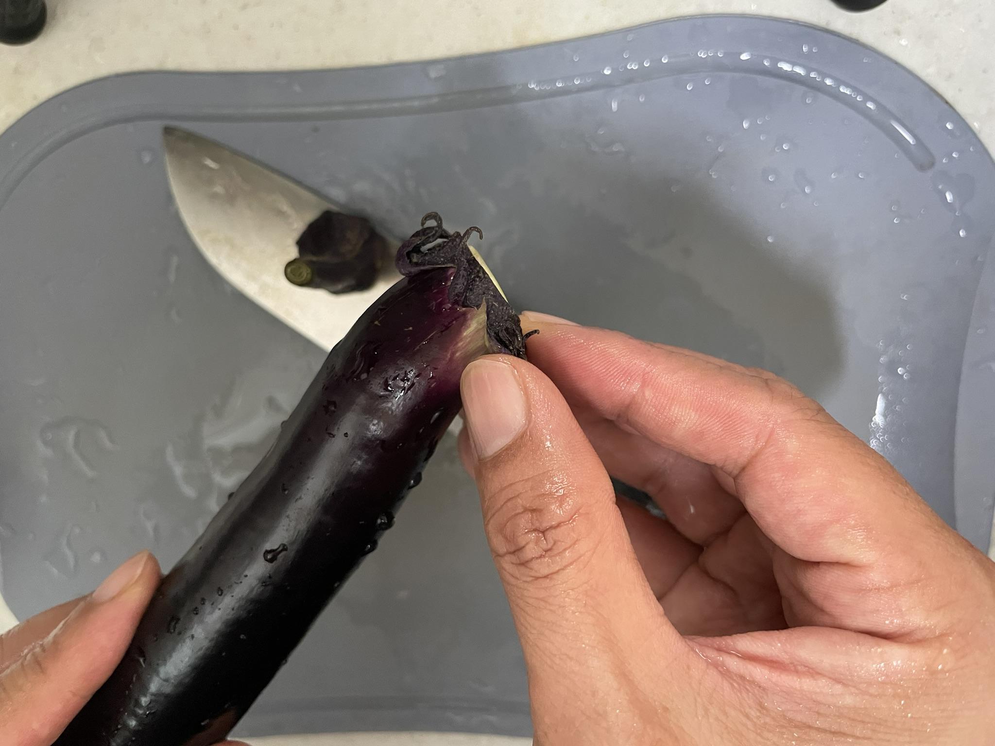가지는 꼭지 부분을 잘라낸 후 덥혀있는 부분을 제거합니다.