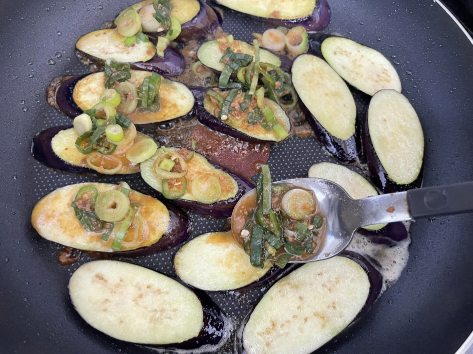 노릇노릇하게 구워지면 만들어둔 양념을 가지 위에 숟가락으로 뿌려 줍니다.