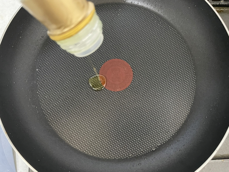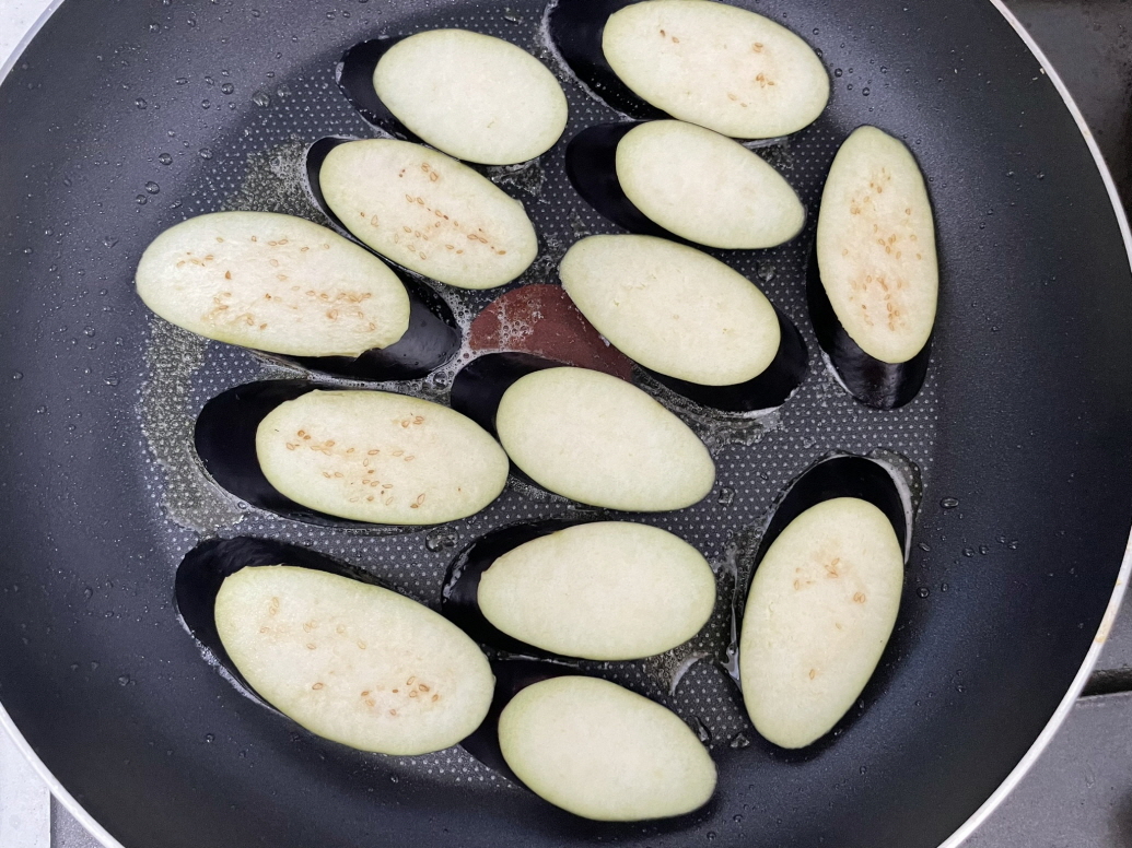 프라이팬에 식용유를 두르고 가지를 양쪽으로 뒤집으며 구워줍니다.