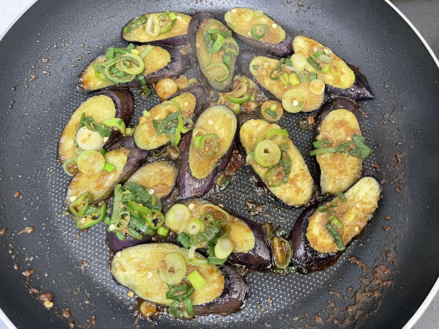 이상태에서 가지를 뒤집지 않고 프라이팬을 들고 흔들어서 가지가 브라이팬 바닥에 있는 양념이 묻도록 해도 가지에 양념이 적당히 베어 졸여집니다..