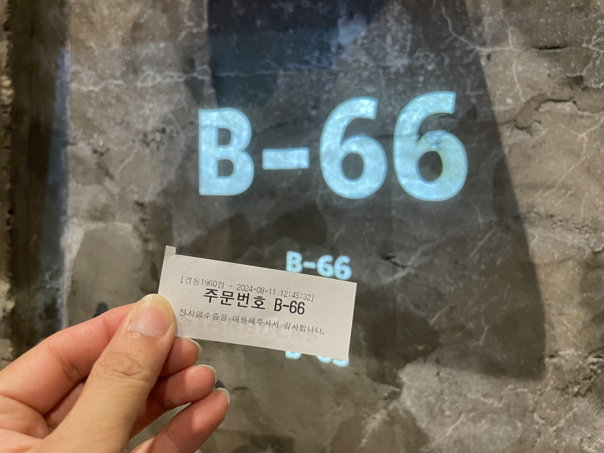음료가 나오면 벽면에 이렇게 음료번호가 나와요. 공간이 넓으니까 부르지 않고 앞, 뒤로 음료번호를 프로젝터로 쏴 주네요.