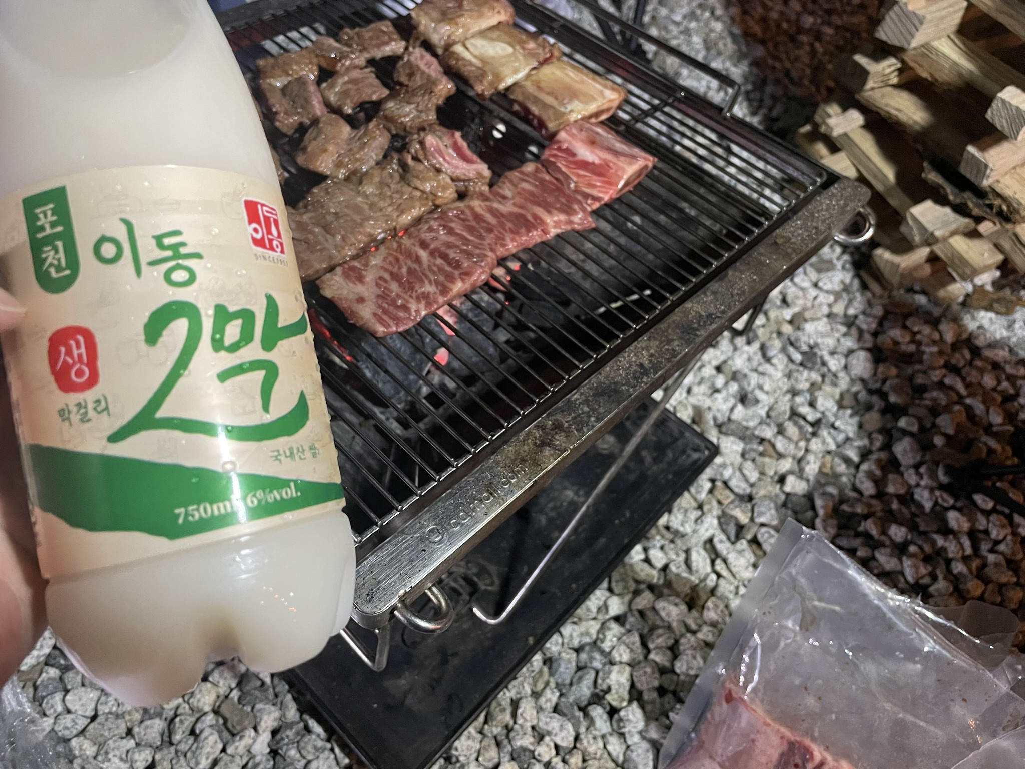 캠핑장에서 구워 먹는 이동 갈비와 막걸리는 정말 꿀맛이네요.