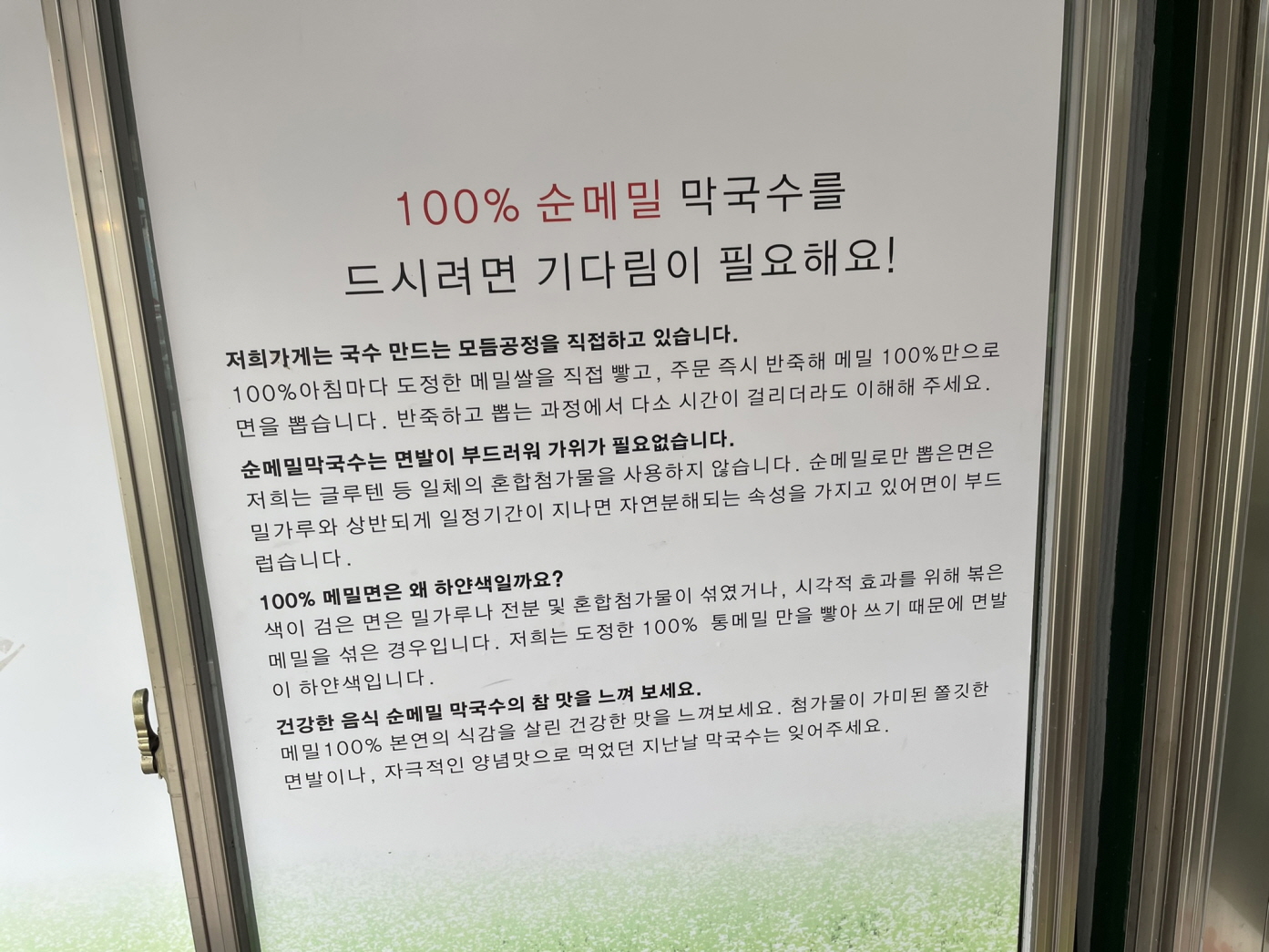 이 집은 100%순매밀 막국수라고 해요. 주문 후 바로 면을 뽑아 삶아서 나와요. 그래서 주문 후에 음식이 나오는데 시간이 걸리는 듯해요.