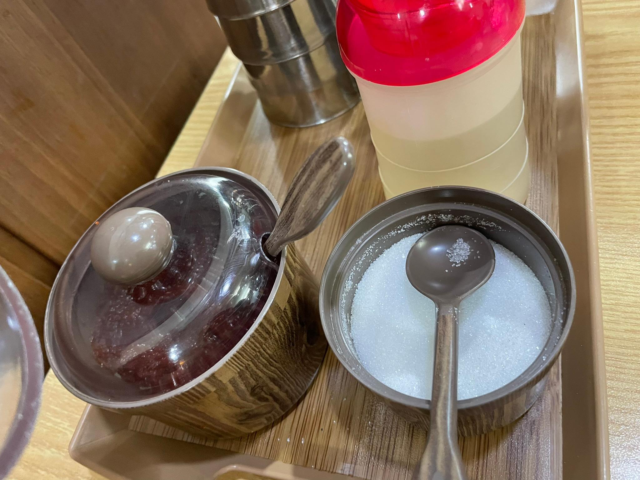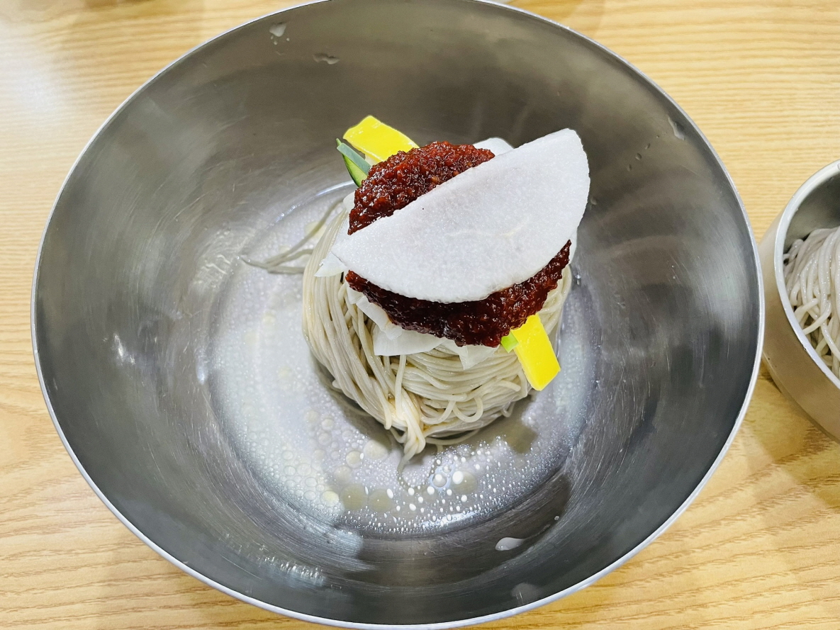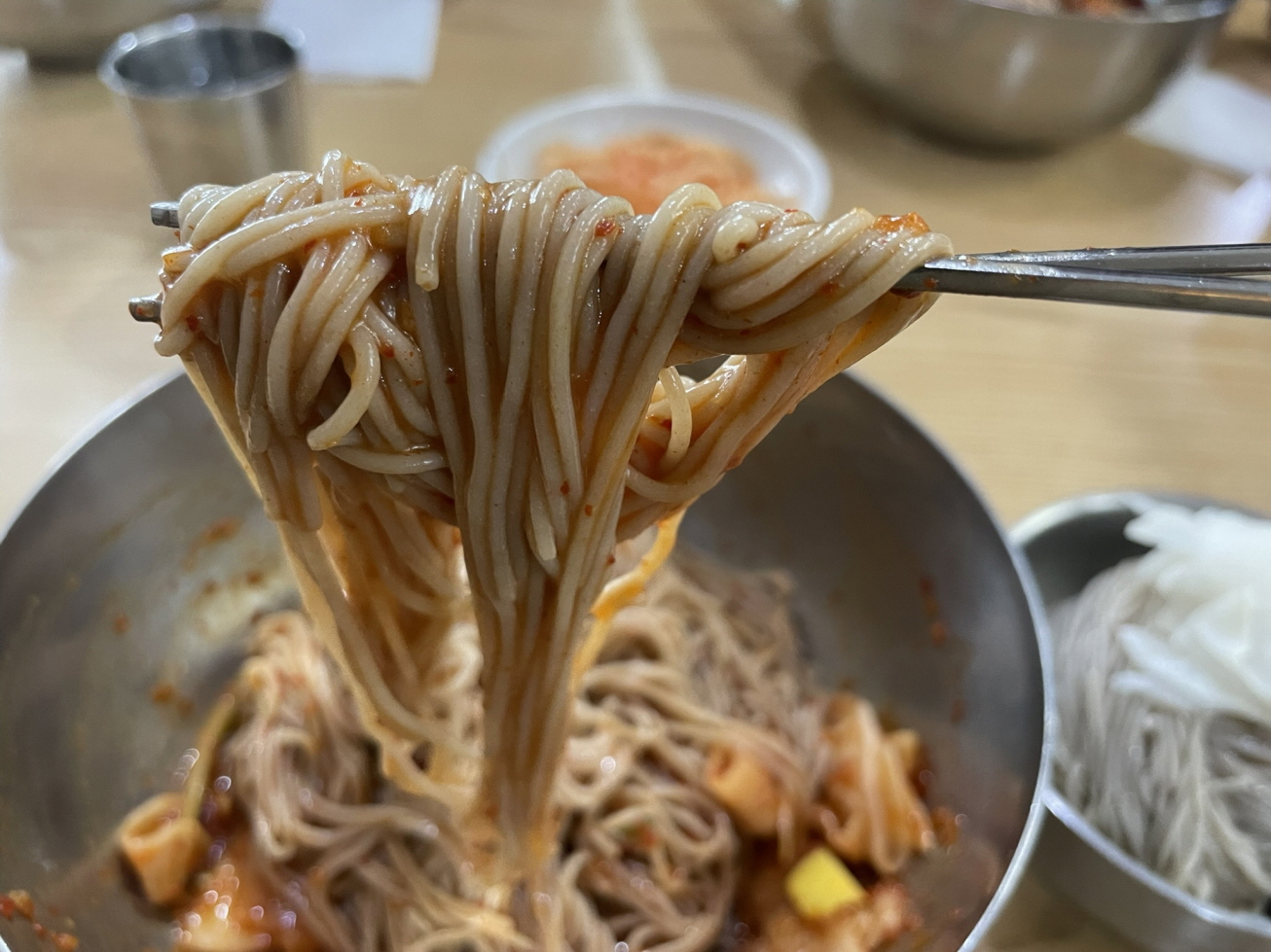 비빔막국수는 기대했던 그 맛입니다. 메뉴 모두 곱빼기는 없어요. 사리추가 주문해야 합니다. 비빔막국수 사리를 추가하고 양념장이 모자라면 테이블마다 있는 다진 양념을 넣으면 돼요.