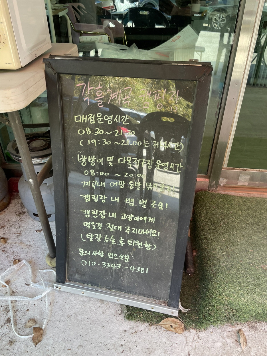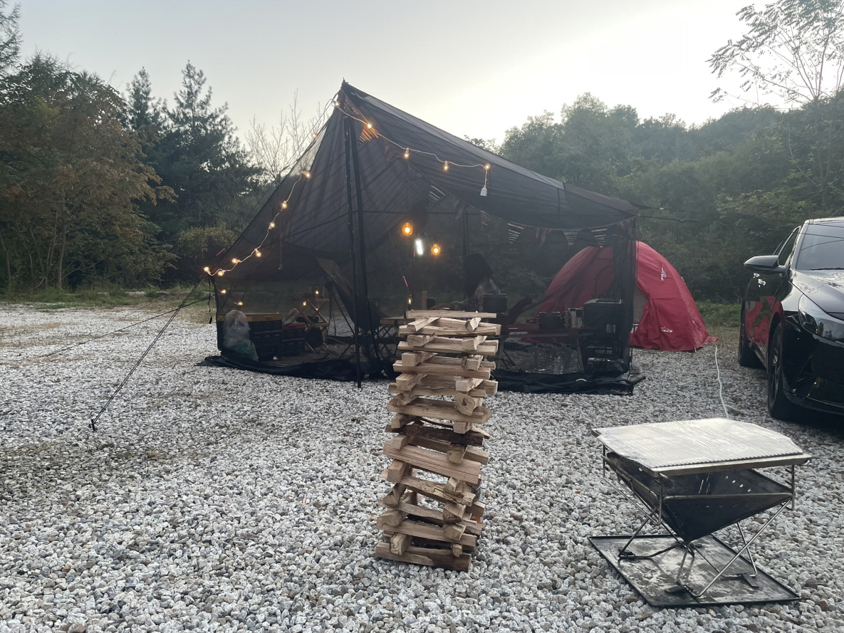 사무실에 먼저 가서 체크인 하고 쓰레기 봉투를 받아옵니다. 캠핑에 빠질 수 없는 장작을 구매하여 예약된 자리로 갑니다. 안내판에 벌이나 뱀이 있을 수 있다고 나와있는데 저희가 있는 동안 뱀과 벌은 없었어요. 이제 가을이니까 먹이를 구하려고 내려오는 뱀이 있을 수 있으니 조심하세요. 혹시 모르니 막대기 같은 거라도 준비해 놔야…ㅋㅋ