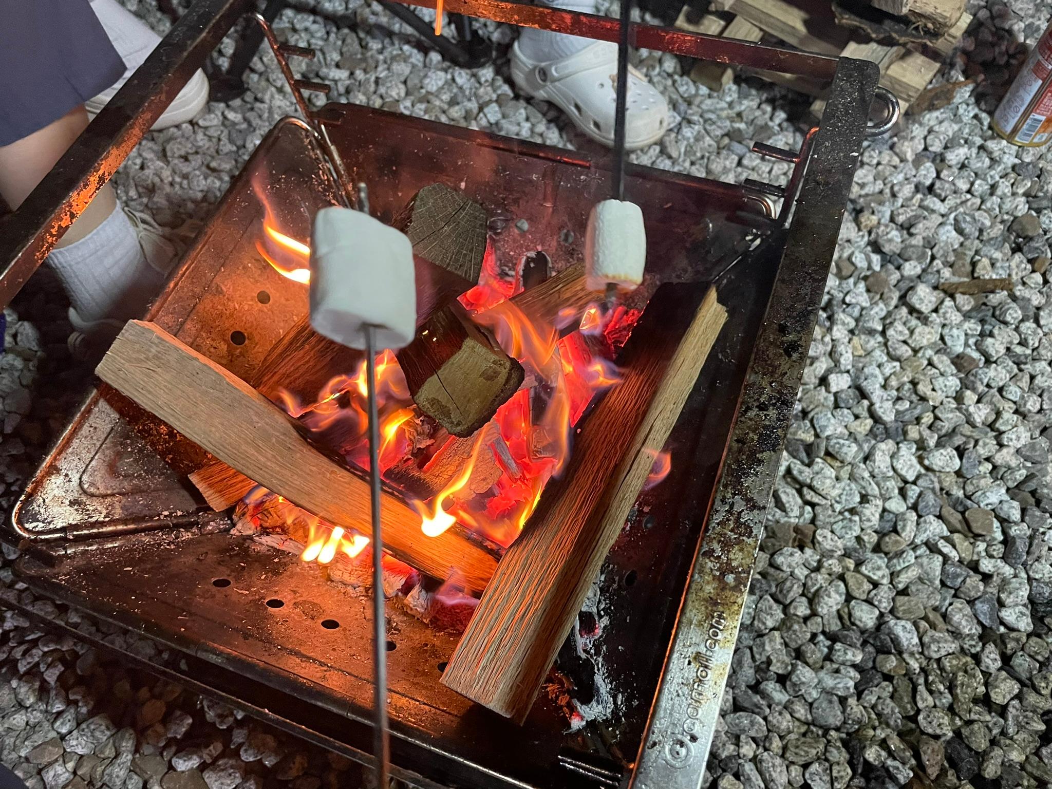장작을 태우며 머쉬멜로우를 구워 먹어요.
