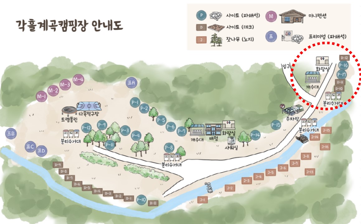 이 구역은 아래 사진과 같이 5사이트만 동떨어진 구역이에요. 캠핑장 안내도와 비교해서 보세요. 이 구역은 사람이 별로 없어서 조용하네요.
