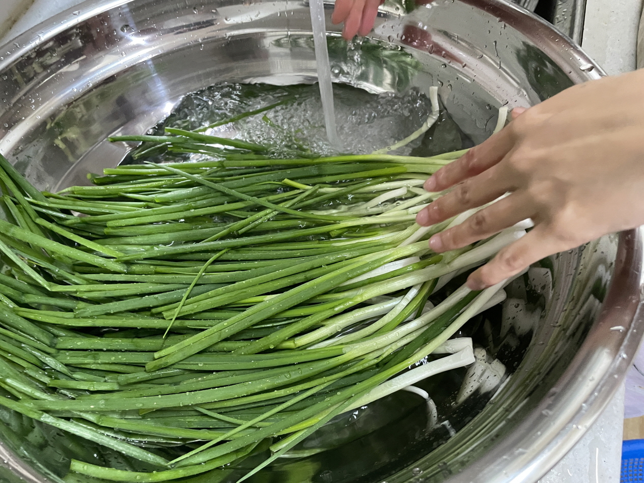1 쪽파를 먼저 손질합니다. 뿌리를 잘라내고, 끝단에 상한 부분은 잘라냅니다.